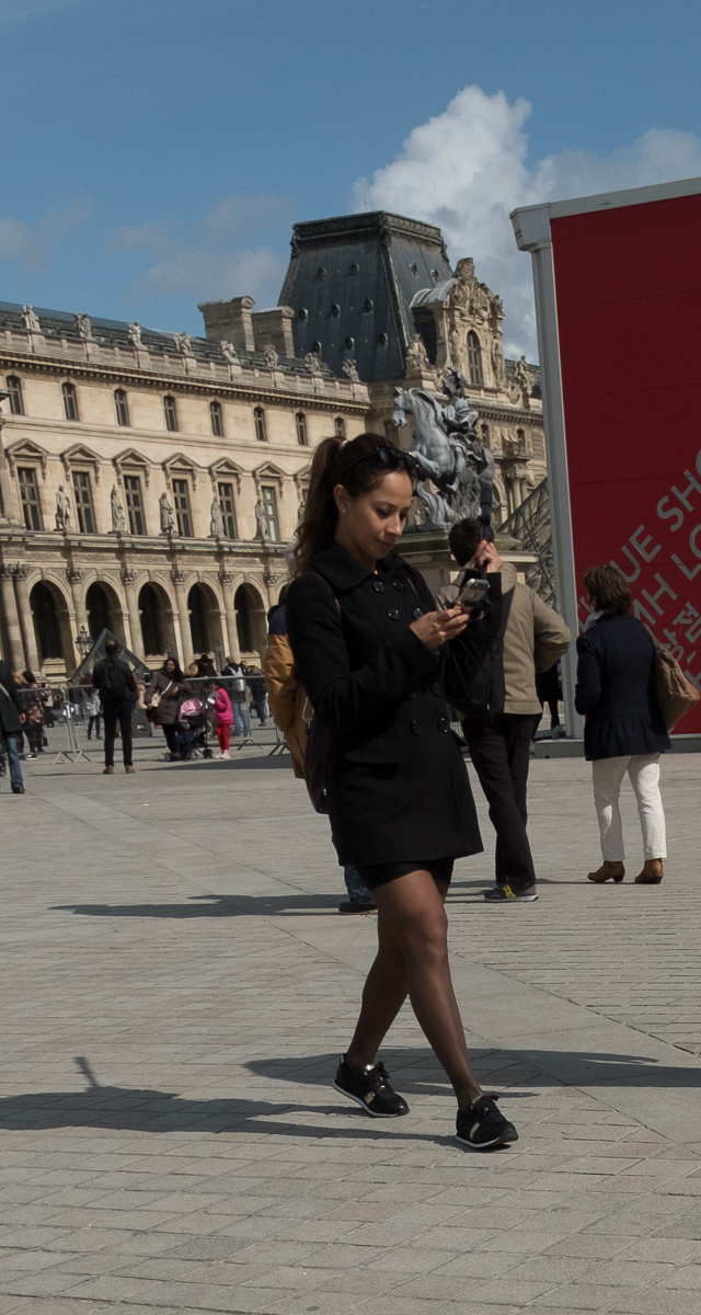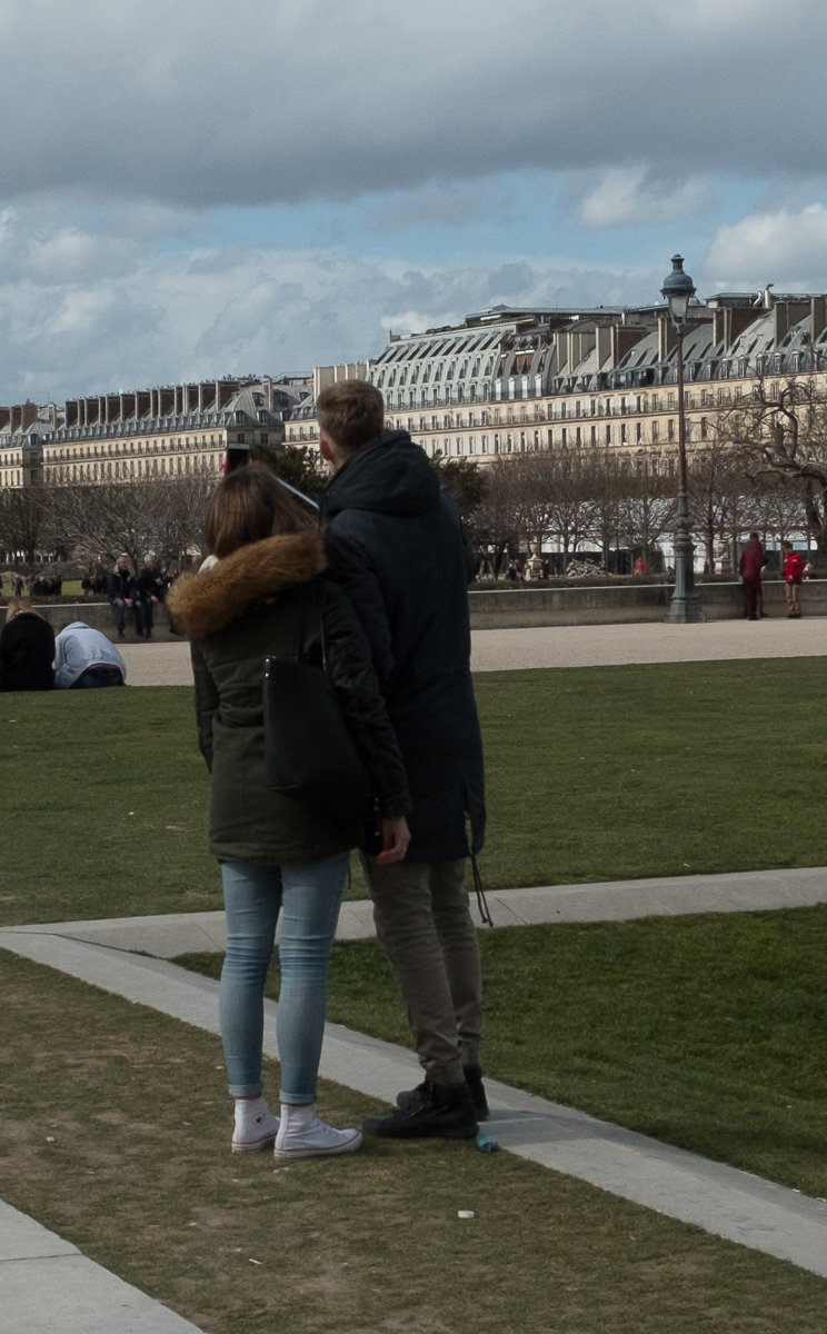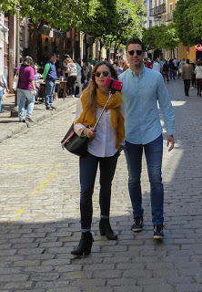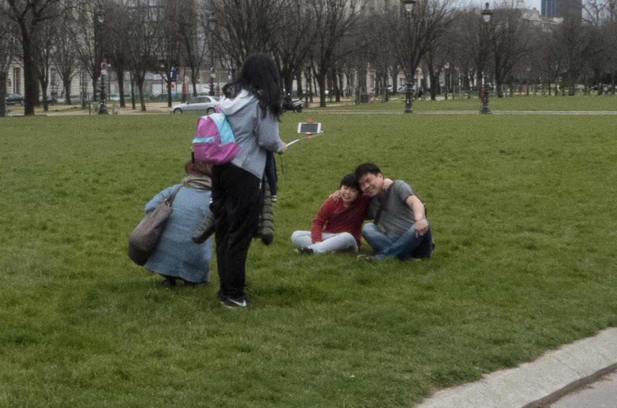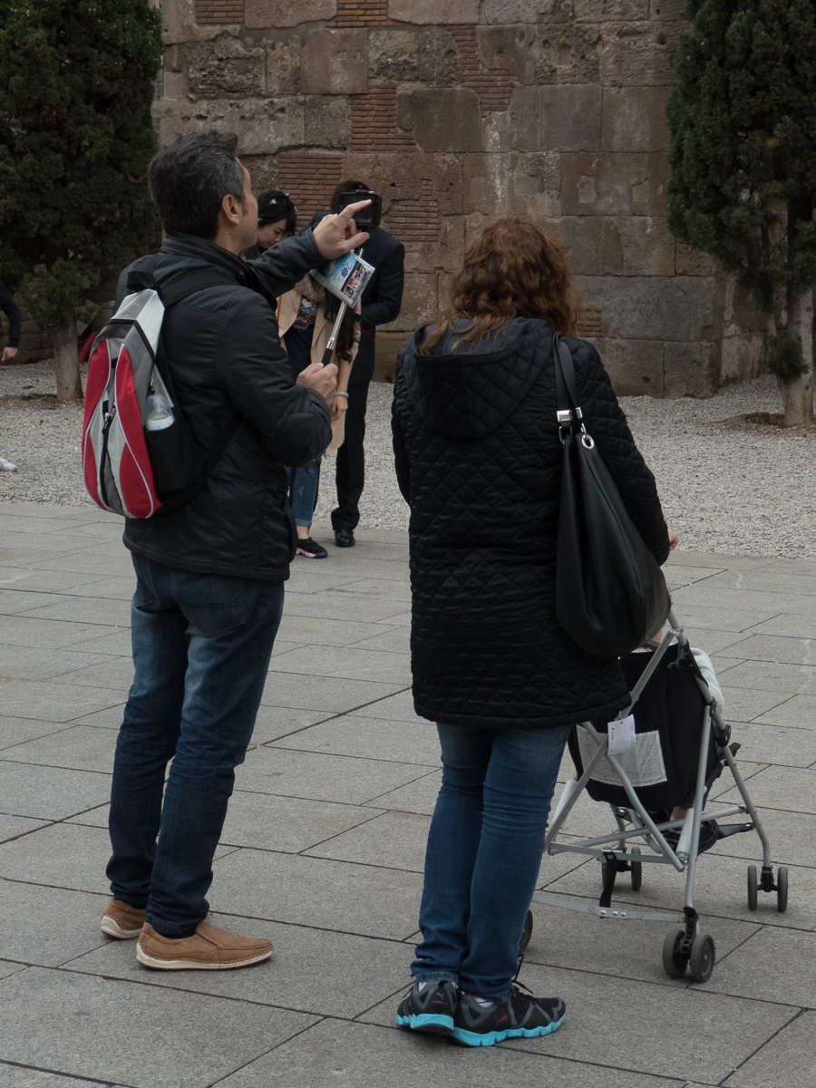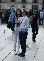 It’s not as easy as it looks – I have to be careful not to get caught. Although I’m probably overstating the actual danger because nine times out of ten these people are so absorbed in getting the perfect photo of themselves that they really don’t notice me taking their picture. Sometimes I try to get in their shot, so they’ll have a memory of me recording their memory. I miss a lot of opportunities since I have to be really quick on the draw. And location is important too – in Paris the Tuileries were the best, especially between the Louvre and the Ferris wheel. The courtyard outside the cathedral in Barcelona was a very rich hunting ground – I could have spent all day there filling up SD cards. I’ve not yet determined the best place in Sevilla, although our street is shaping up pretty well.