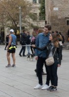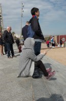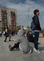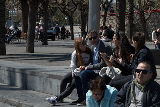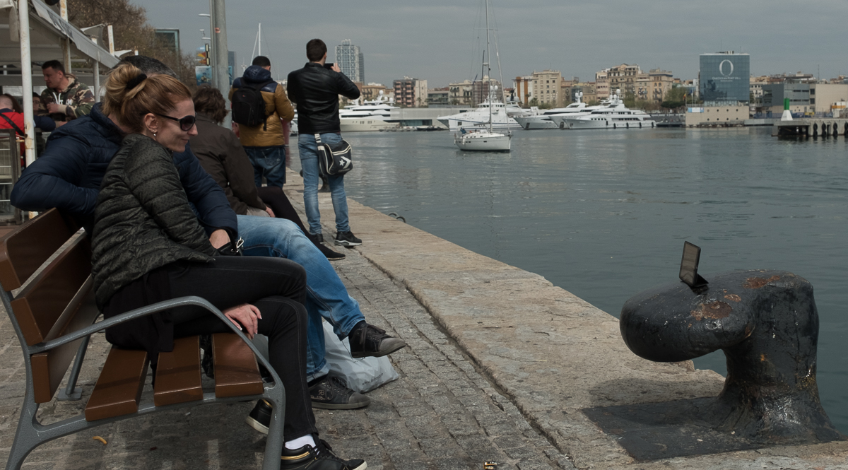 I found this couple on the beach in Barceloneta. She took 4 photos, one from each cardinal point. Ocean, boardwalk, waterfront buildings, boardwalk. I only got 3.