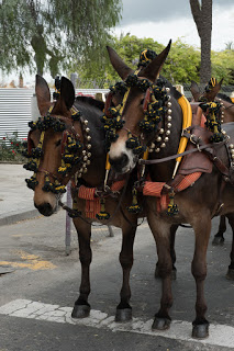 This little bit of luck turned out nicely for us. Lots and lots of photo opportunities out in the middle of a wide open street. Every type of carriage – two horse, four horse, six horse – in all sizes, shapes and colors, many carrying women in traditional dress and driven by men in the same. Even a large contingent of mules and the local police color guard. They were coming up the street, passing the bull ring, turning and continuing around the block to enter the ring from the opposite side. When they petered out on the main thoroughfare we went down a side street and waded into the crowd to watch them make the turn into the stadium. The crowd was deep enough that I had to hold my camera over my head and shoot blindly, still managing to get some decent shots. The line of carriages was pretty backed up here – it was a hard right turn into a narrow street and a lot horses didn’t want to do it.