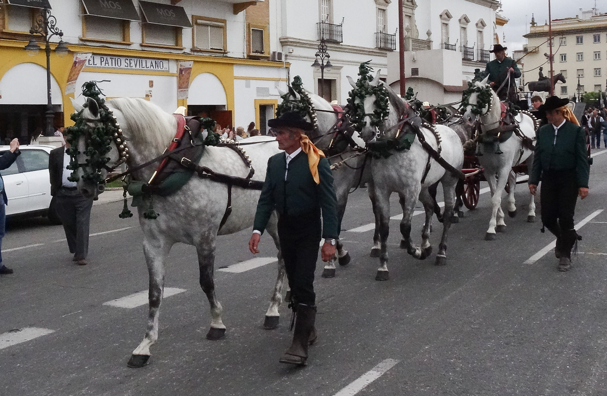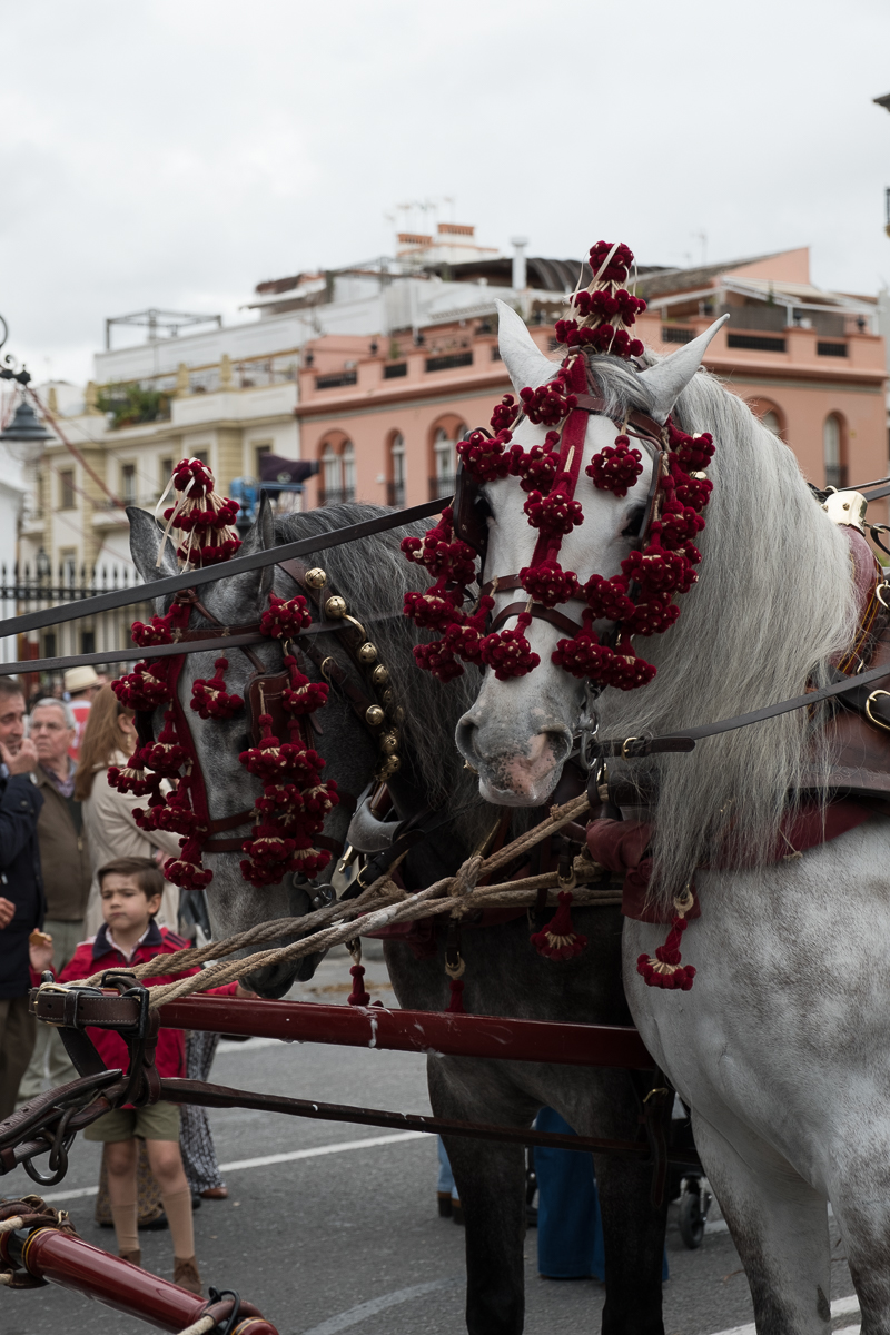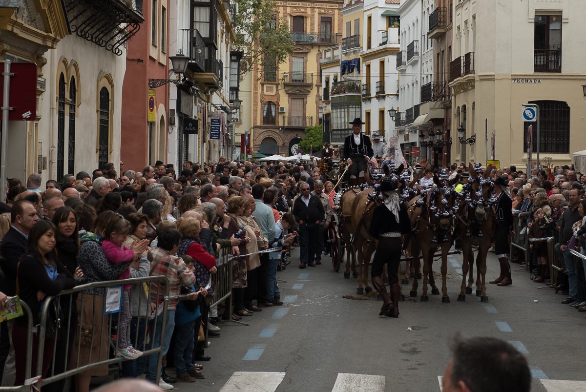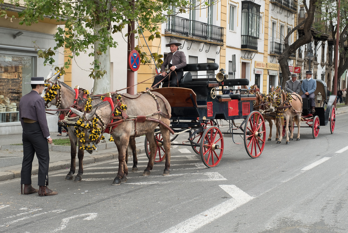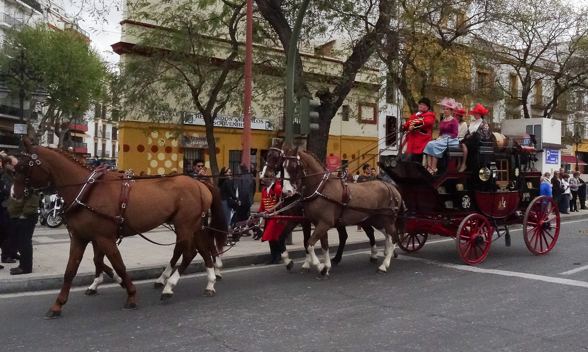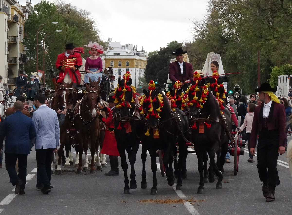 Crossing back to the Santa Cruz side we saw a big crowd of people down towards the bull ring, La Plaza de Torros de la Real Maestranza. Being naturally curious we took a right turn and walked up the still-closed avenue and stumbled into a big procession of horse-drawn carriages winding its way through the Arenal neighborhood. Now the funny thing is , we’d asked Macarena if there were any parades associated with La Feria and she had emphatically said, “No.” Not “I don’t know” or I’ll find out” but rather a “no” that made me feel like a rube for asking. Yet son-of-a-gun here we were right in the middle of one. Lightning has actually struck twice for us here in Spain because on our first trip to Barcelona in 2009, we got up on our first morning there and walked out the front door smack into a horse parade.