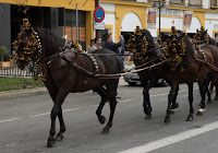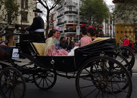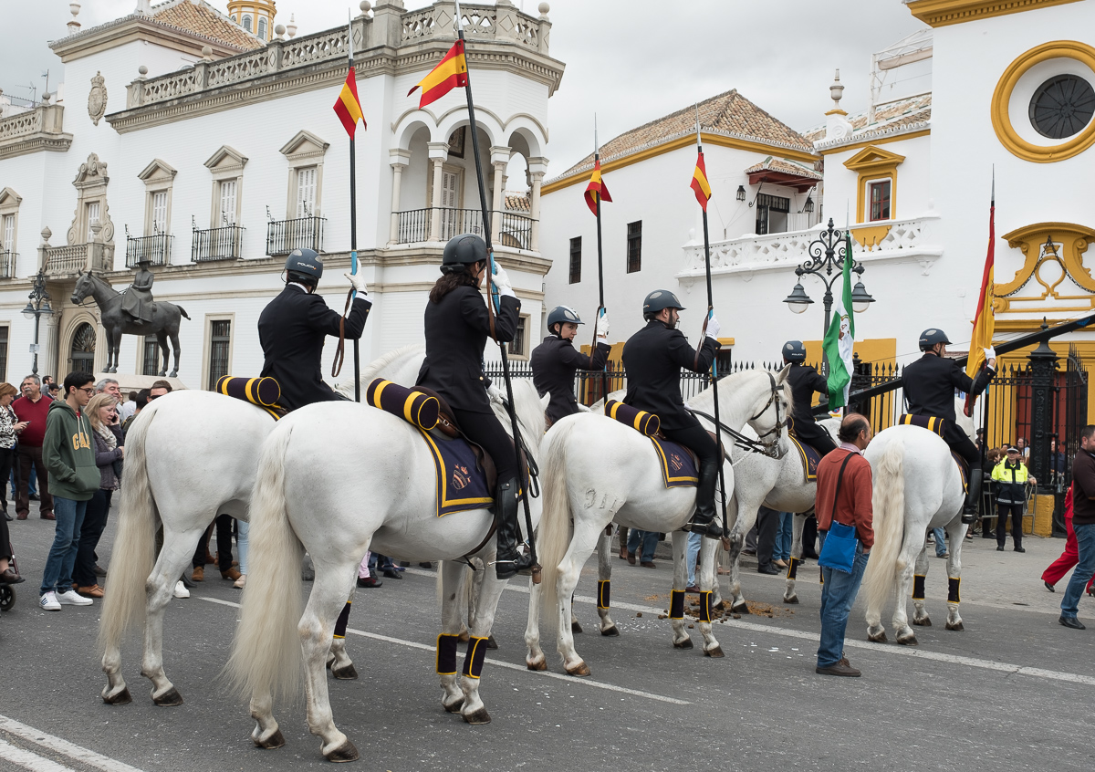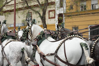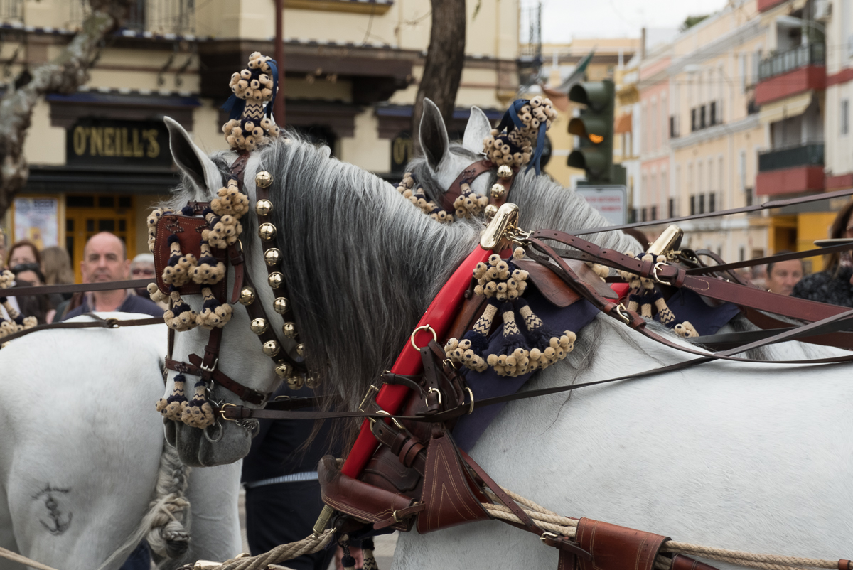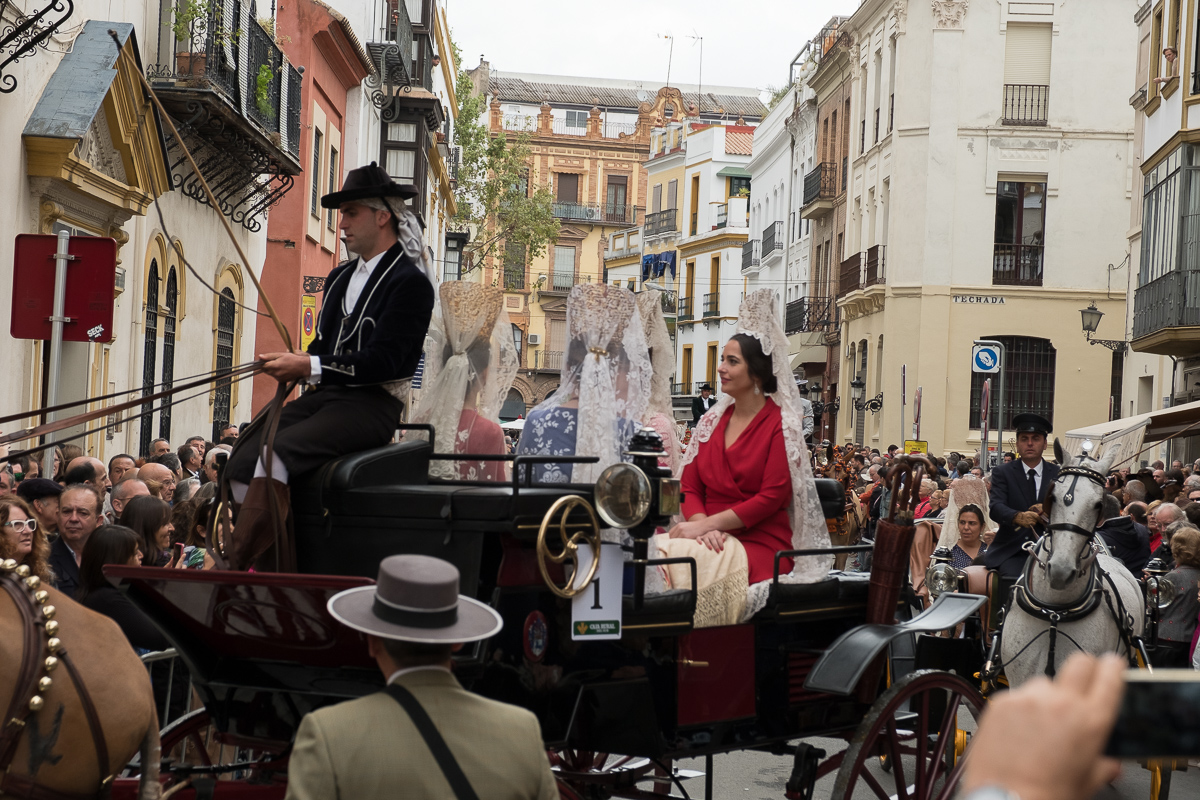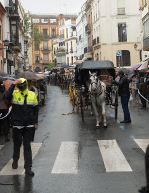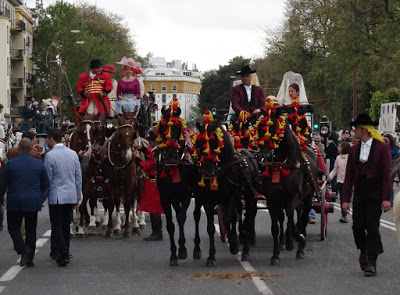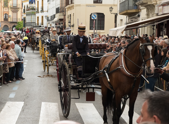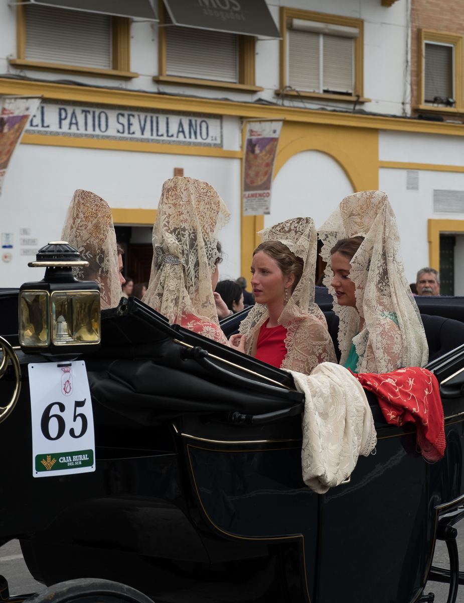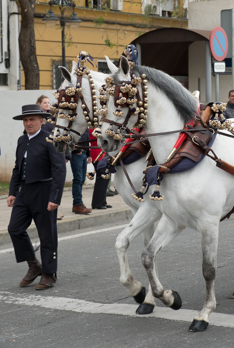 Crossing back to the Santa Cruz side we saw a big crowd of people down towards the bull ring, La Plaza de Torros de la Real Maestranza. Being naturally curious we took a right turn and walked up the still-closed avenue and stumbled into a big procession of horse-drawn carriages winding its way through the Arenal neighborhood. Now the funny thing is , we’d asked Macarena if there were any parades associated with La Feria and she had emphatically said, “No.” Not “I don’t know” or I’ll find out” but rather a “no” that made me feel like a rube for asking. Yet son-of-a-gun here we were right in the middle of one. Lightning has actually struck twice for us here in Spain because on our first trip to Barcelona in 2009, we got up on our first morning there and walked out the front door smack into a horse parade.
