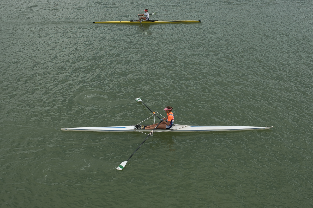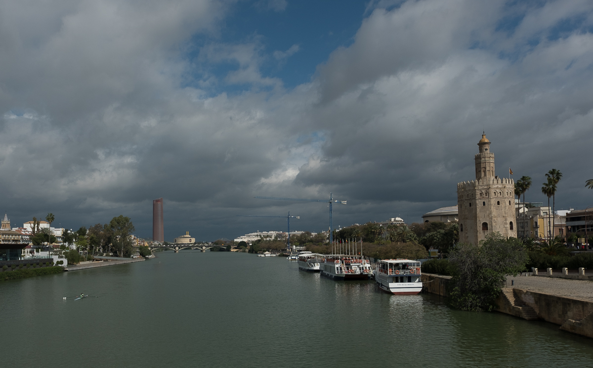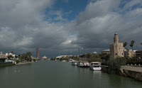 Having nothing better to do we decided to cross the river and walk along the promenade through Triana and down to the beautiful iron bridge, Puente Isabel II. The big avenidaalong the river – Paseo de Colon -was blocked by the police, for no obvious reason since there didn’t seem to be anything going on. I chuckled to see people standing at the crosswalk waiting for the green signal on a street with no cars. We crossed the bridge, taking a few moments to watch the scullers on the Guadalquivir with a tinge of envy- we always say how wonderful it would be to be able to indulge in that sport. But living in the desert, well, not likely. The old royal treasure house, El Torre d’Oro and some modern skyscraper off in the distance bookended the river nicely.
