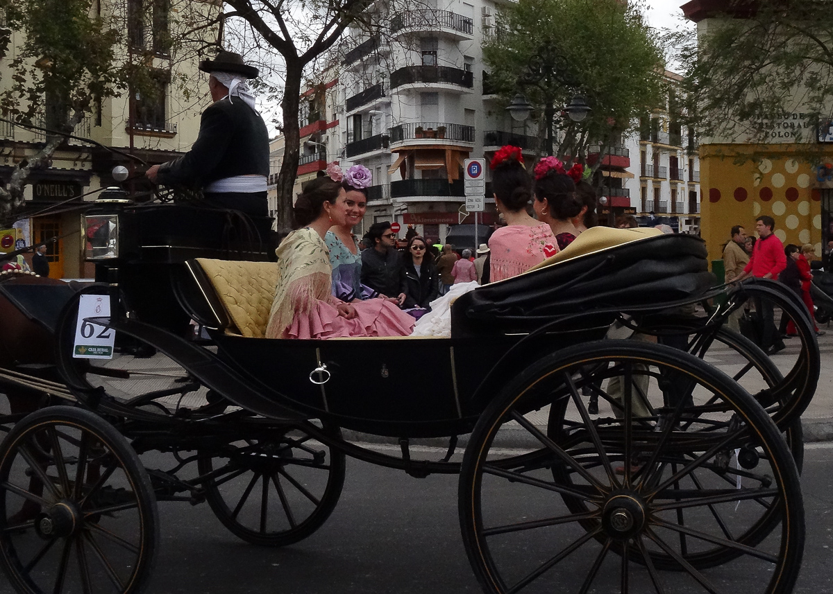 It’s been held at a large open space just at the end of Triana, across the river from where we stay. But the beauty of it is that its influence extends throughout the city with women in flamenca dresses, men in traditional ranch-wear, and beautiful carriages appearing on just about every street corner, throughout every day and into the evening. Sevilla is a horsey city to begin with – there is a thriving carriage ride trade here in the tourist district. But La Feria takes it to an entirely different level. The first time, we stumbled on it – this time we planned to be here.