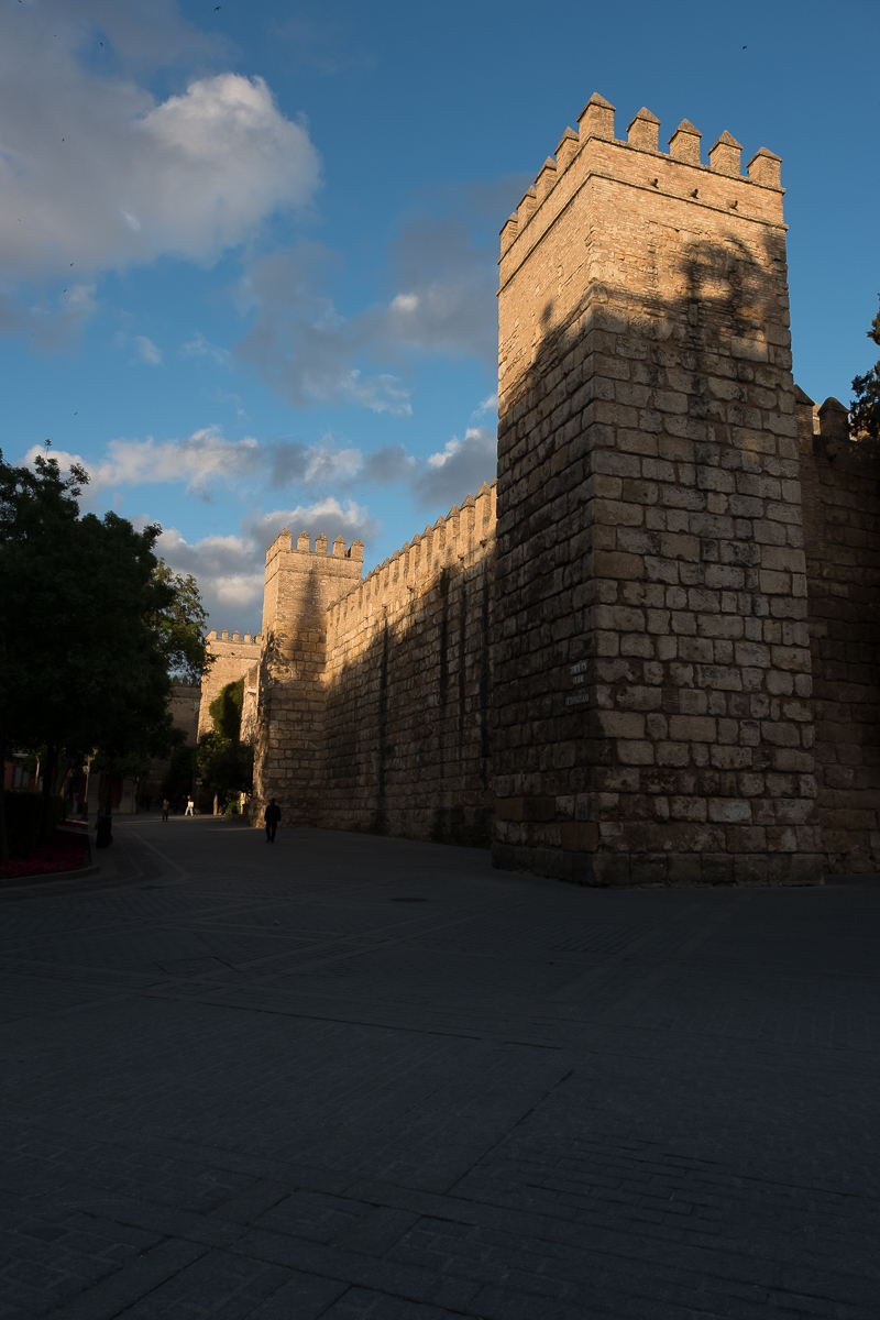 The walk back from San Fernando was grand – strolling down a long paved path through the Jardines de Murillo, past the statue to Columbus and under ancient eucalyptus trees, and bordered along our left side by the vine-covered melon-colored walls of the Alcazar. Coming back around once again to the Callejón, a peacock sitting on the ramparts surprised us with his call. I’d seen his tail but thought it was a palm frond.