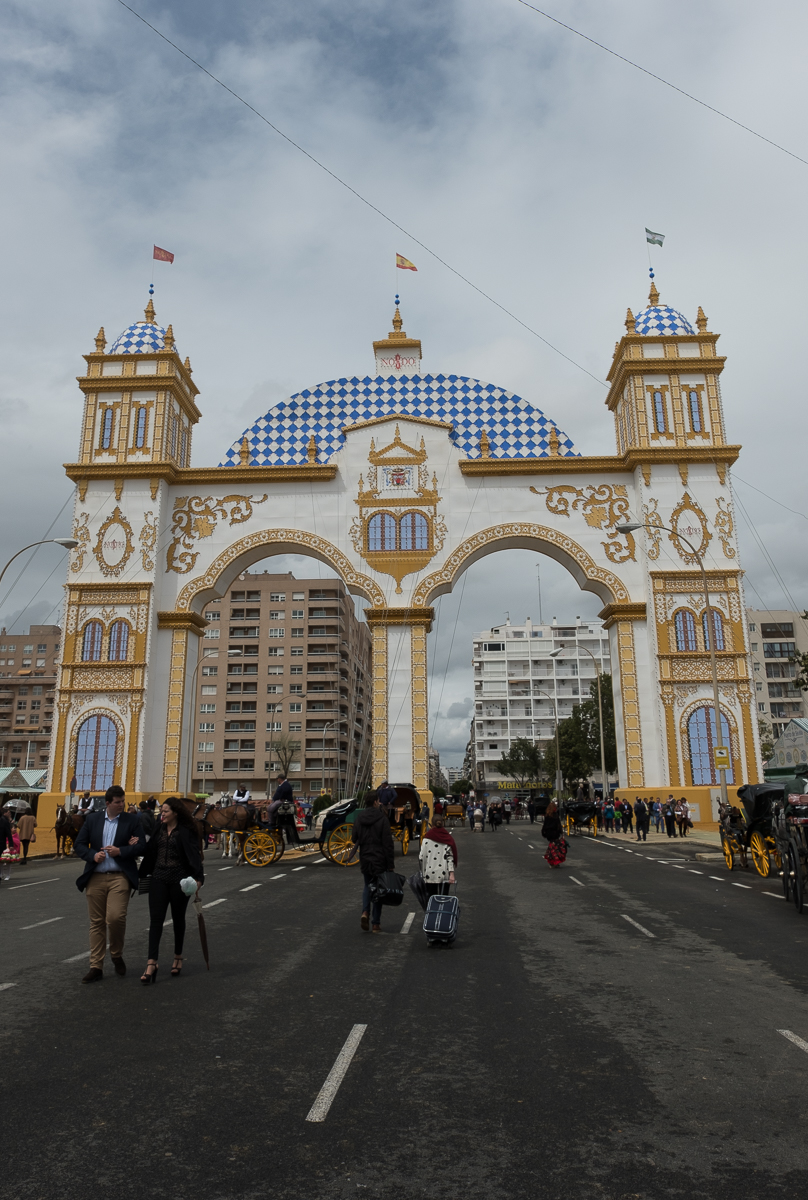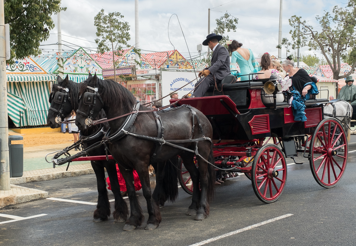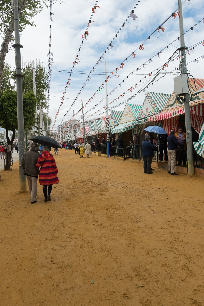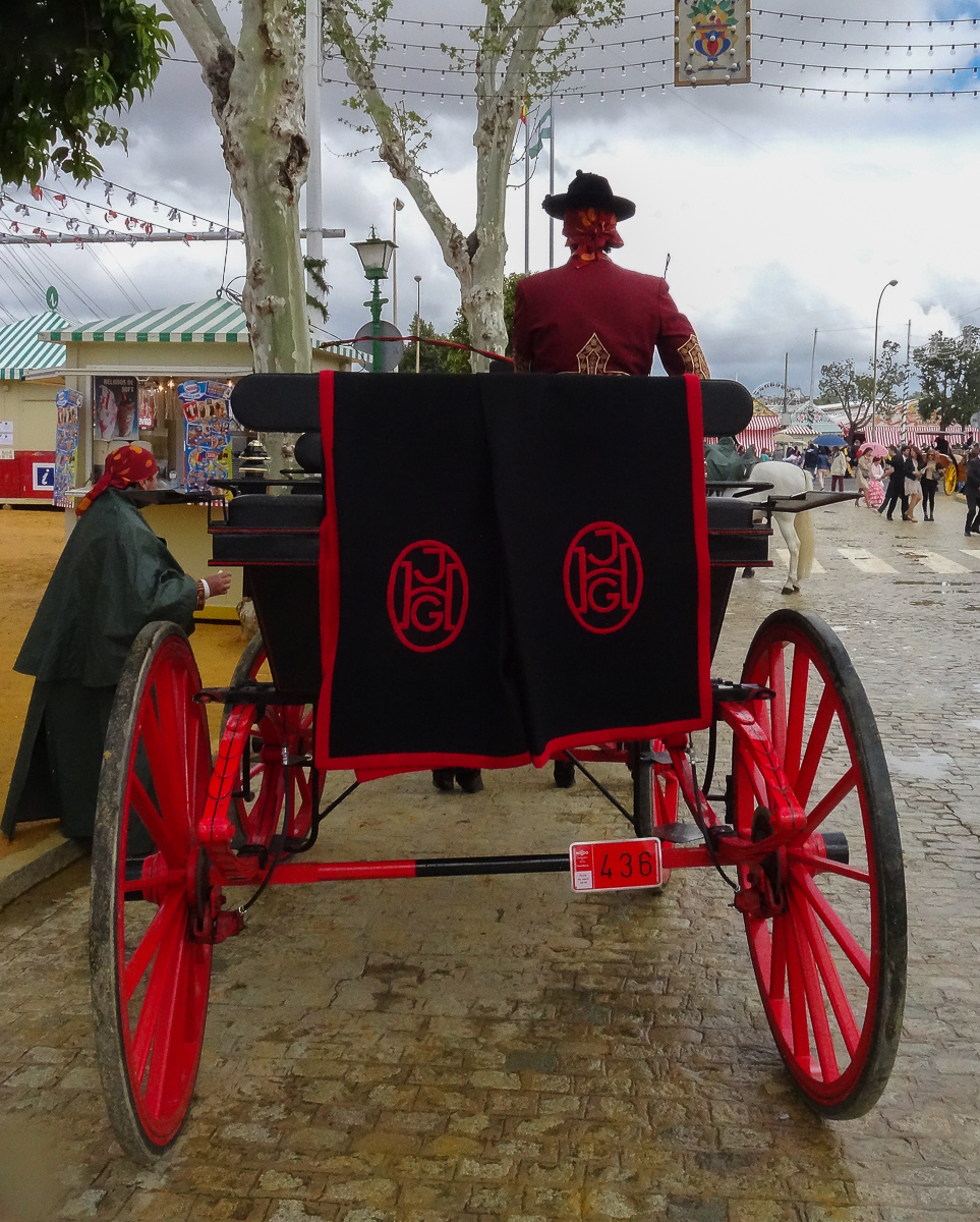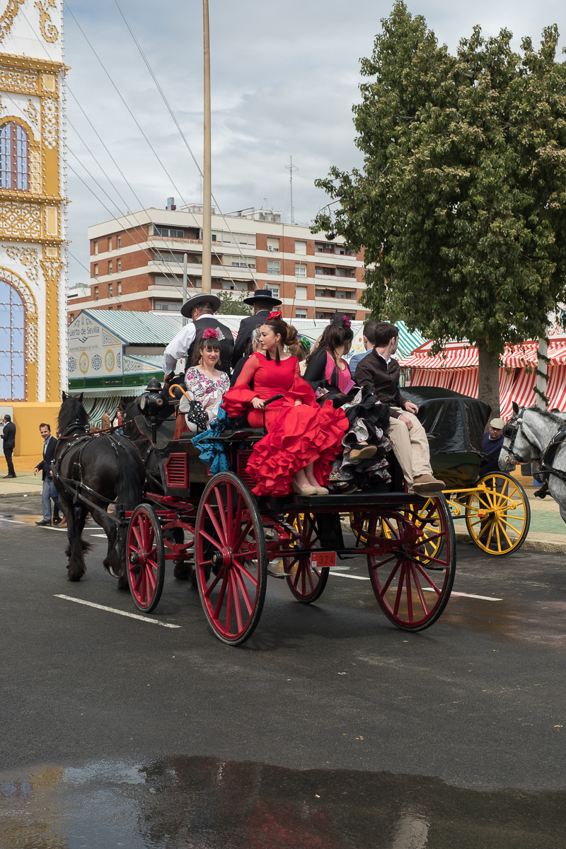 After a lengthy break back home for a genuinely torrential downpour we decided to gird our loins and walk over to La Feria. It’s a long haul and we knew that sooner or later the weather was going to get us, so we dressed appropriately and brought our umbrellas and took off, passing first by the Alfonso XIII where got lucky again – dozens of carriages picking up people to shuttle them over to the fairgrounds. After a photo session there we joined the crowds, crossed the river and began the long trek up Avenida Asunción to the gates.