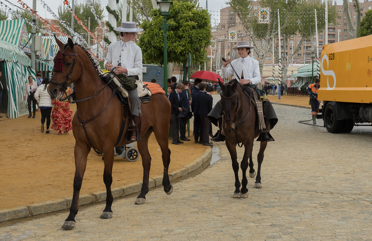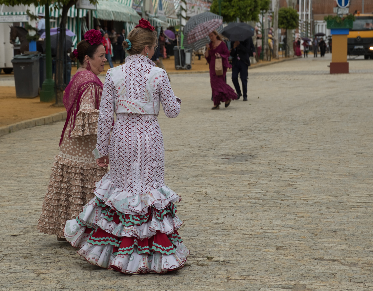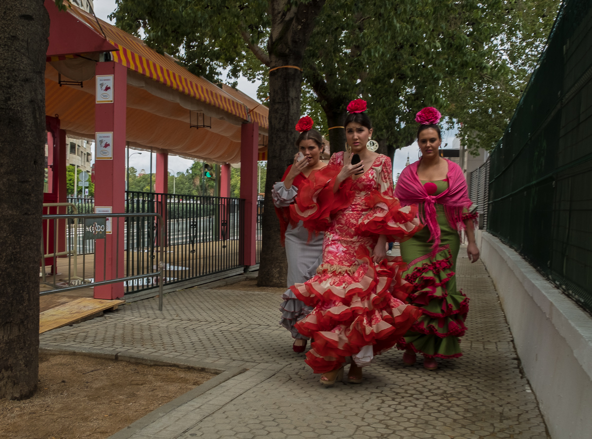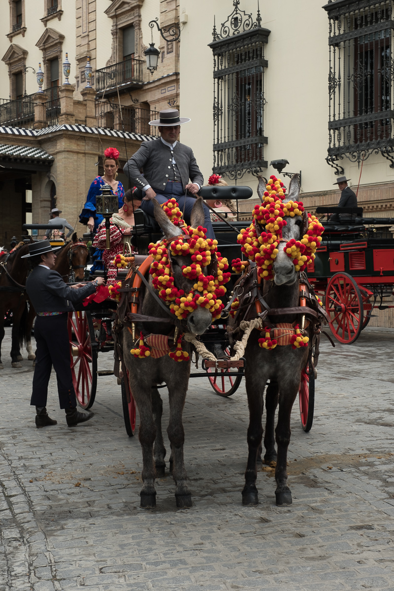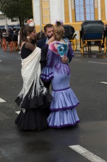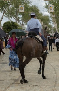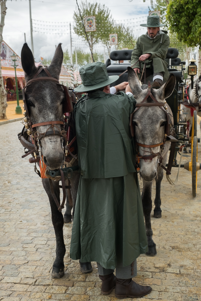 After a lengthy break back home for a genuinely torrential downpour we decided to gird our loins and walk over to La Feria. It’s a long haul and we knew that sooner or later the weather was going to get us, so we dressed appropriately and brought our umbrellas and took off, passing first by the Alfonso XIII where got lucky again – dozens of carriages picking up people to shuttle them over to the fairgrounds. After a photo session there we joined the crowds, crossed the river and began the long trek up Avenida Asunción to the gates.