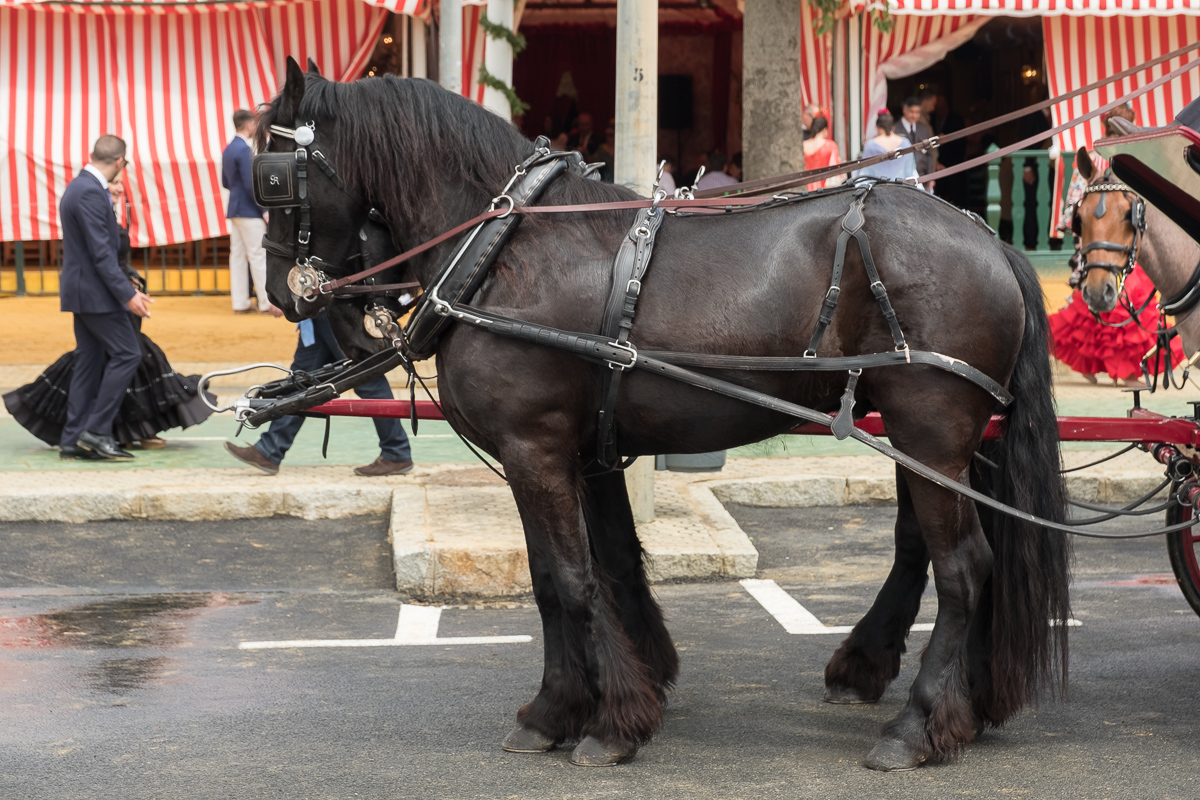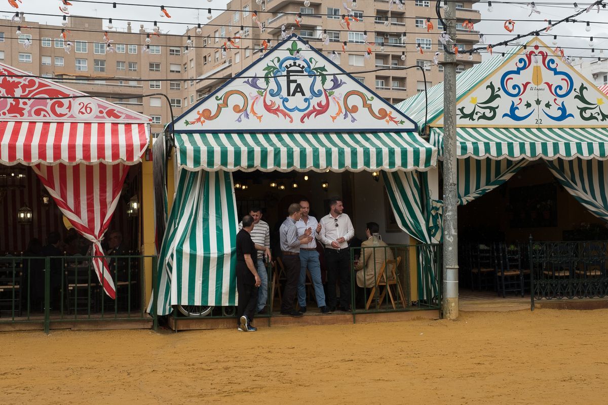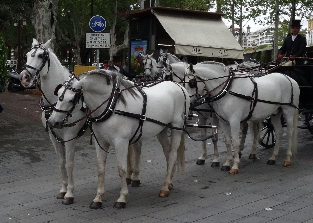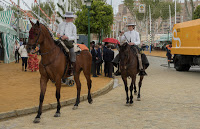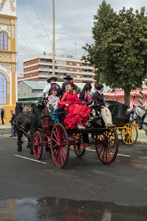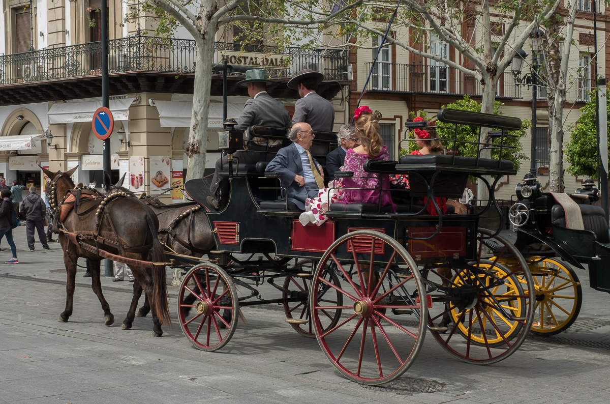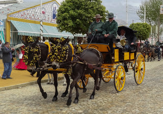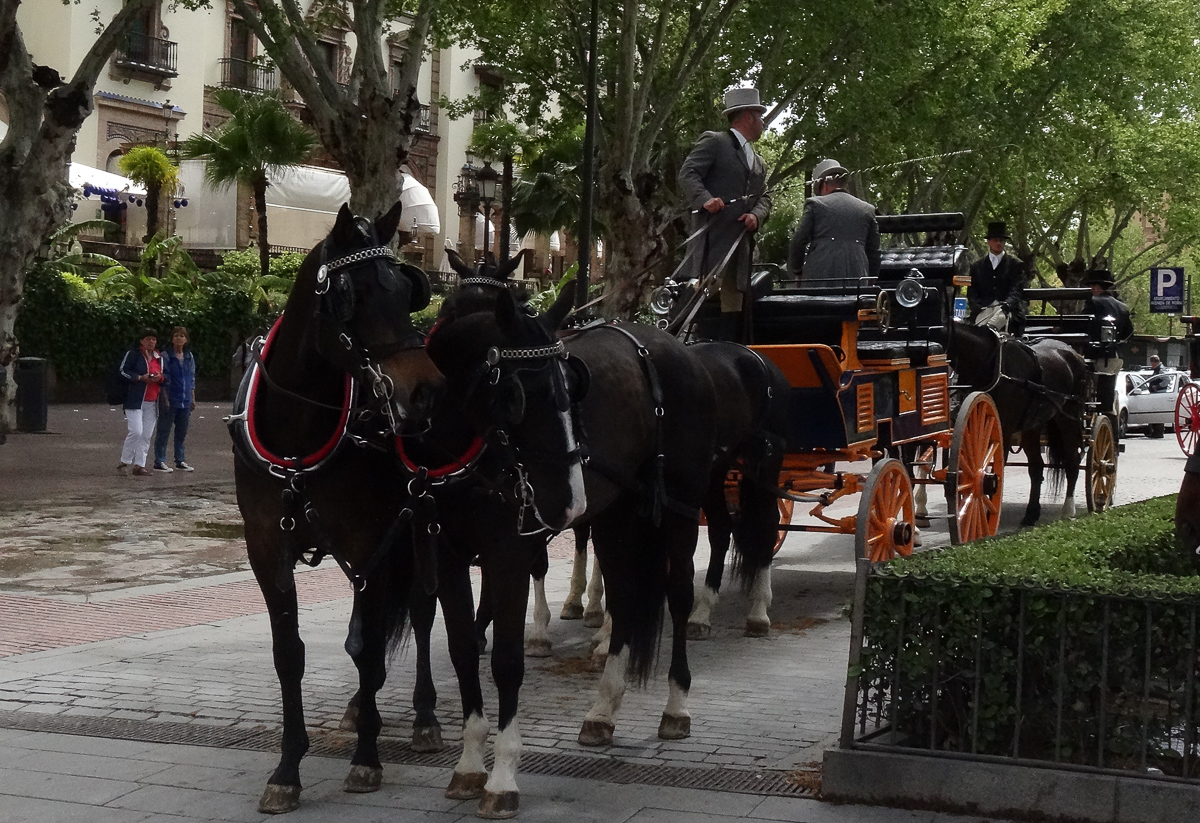 After a lengthy break back home for a genuinely torrential downpour we decided to gird our loins and walk over to La Feria. It’s a long haul and we knew that sooner or later the weather was going to get us, so we dressed appropriately and brought our umbrellas and took off, passing first by the Alfonso XIII where got lucky again – dozens of carriages picking up people to shuttle them over to the fairgrounds. After a photo session there we joined the crowds, crossed the river and began the long trek up Avenida Asunción to the gates.