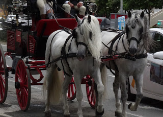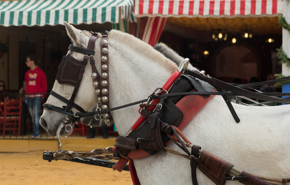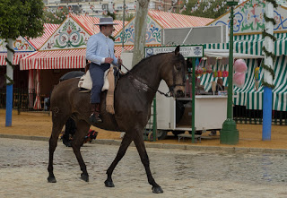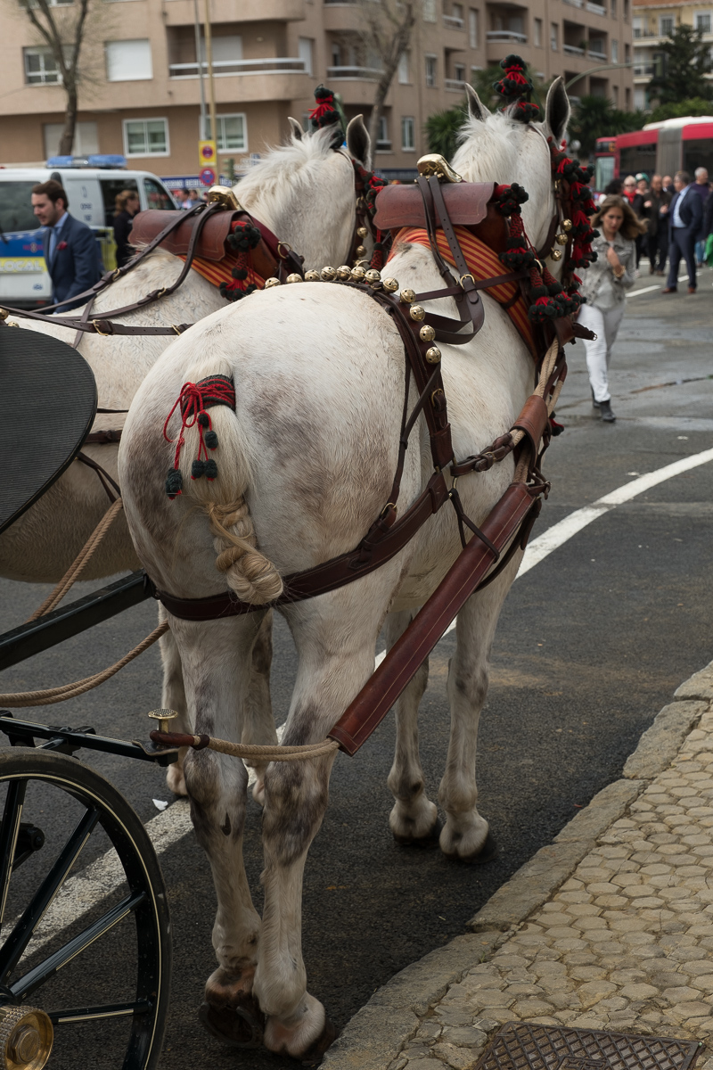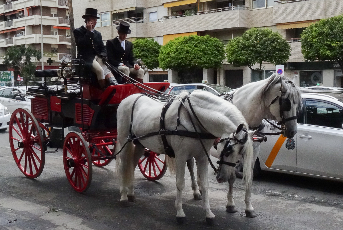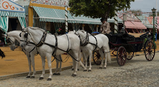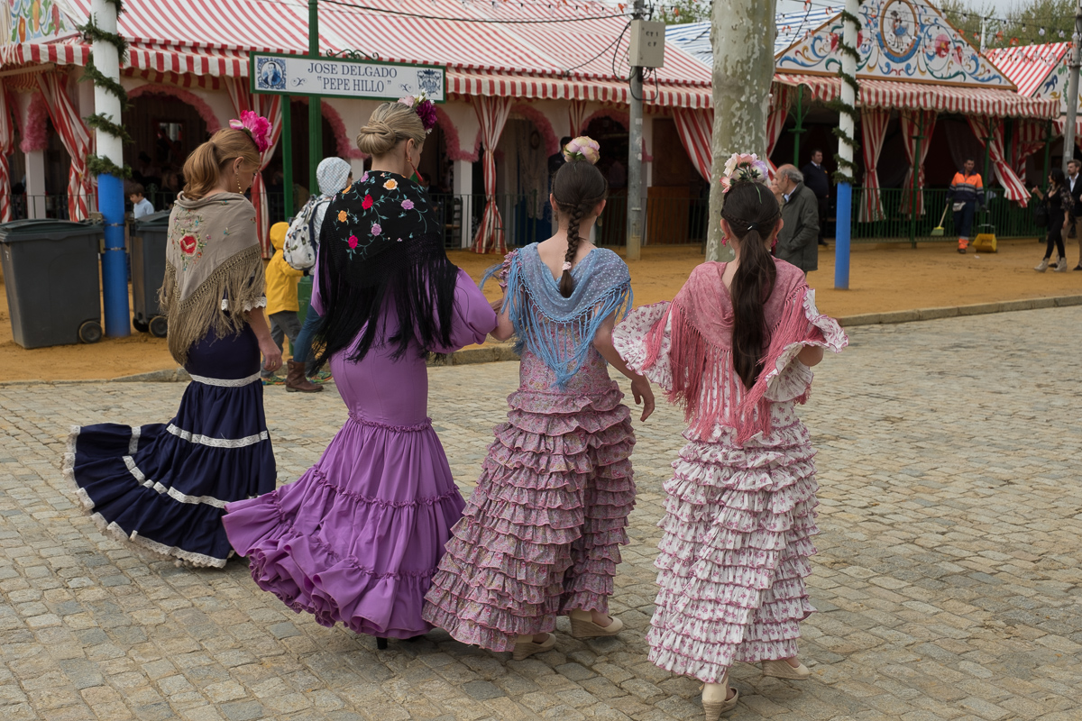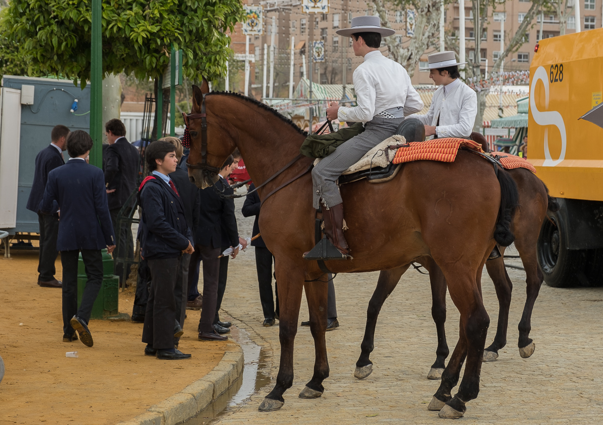 After a lengthy break back home for a genuinely torrential downpour we decided to gird our loins and walk over to La Feria. It’s a long haul and we knew that sooner or later the weather was going to get us, so we dressed appropriately and brought our umbrellas and took off, passing first by the Alfonso XIII where got lucky again – dozens of carriages picking up people to shuttle them over to the fairgrounds. After a photo session there we joined the crowds, crossed the river and began the long trek up Avenida Asunción to the gates.