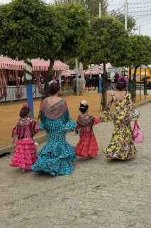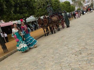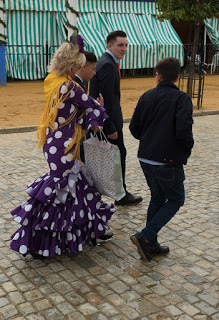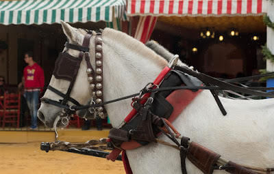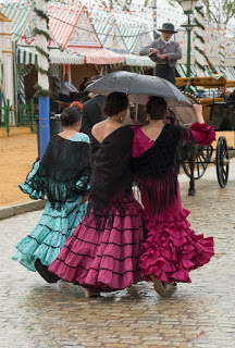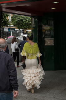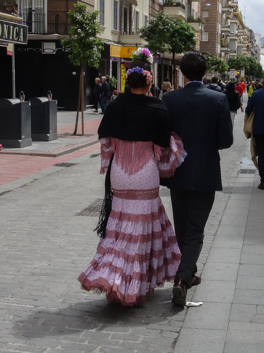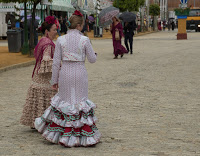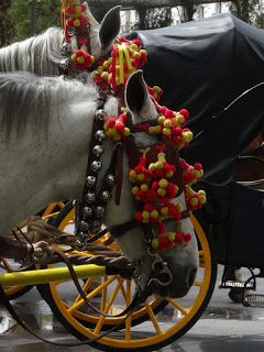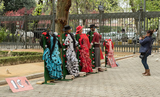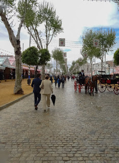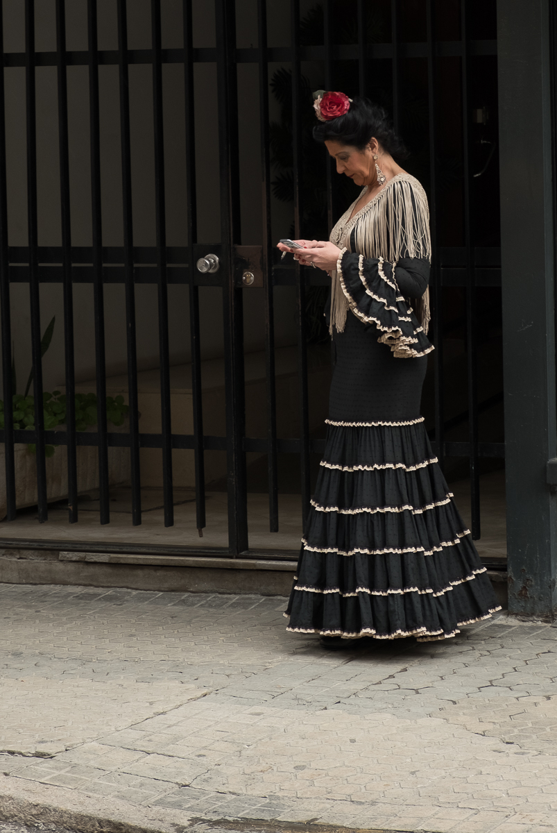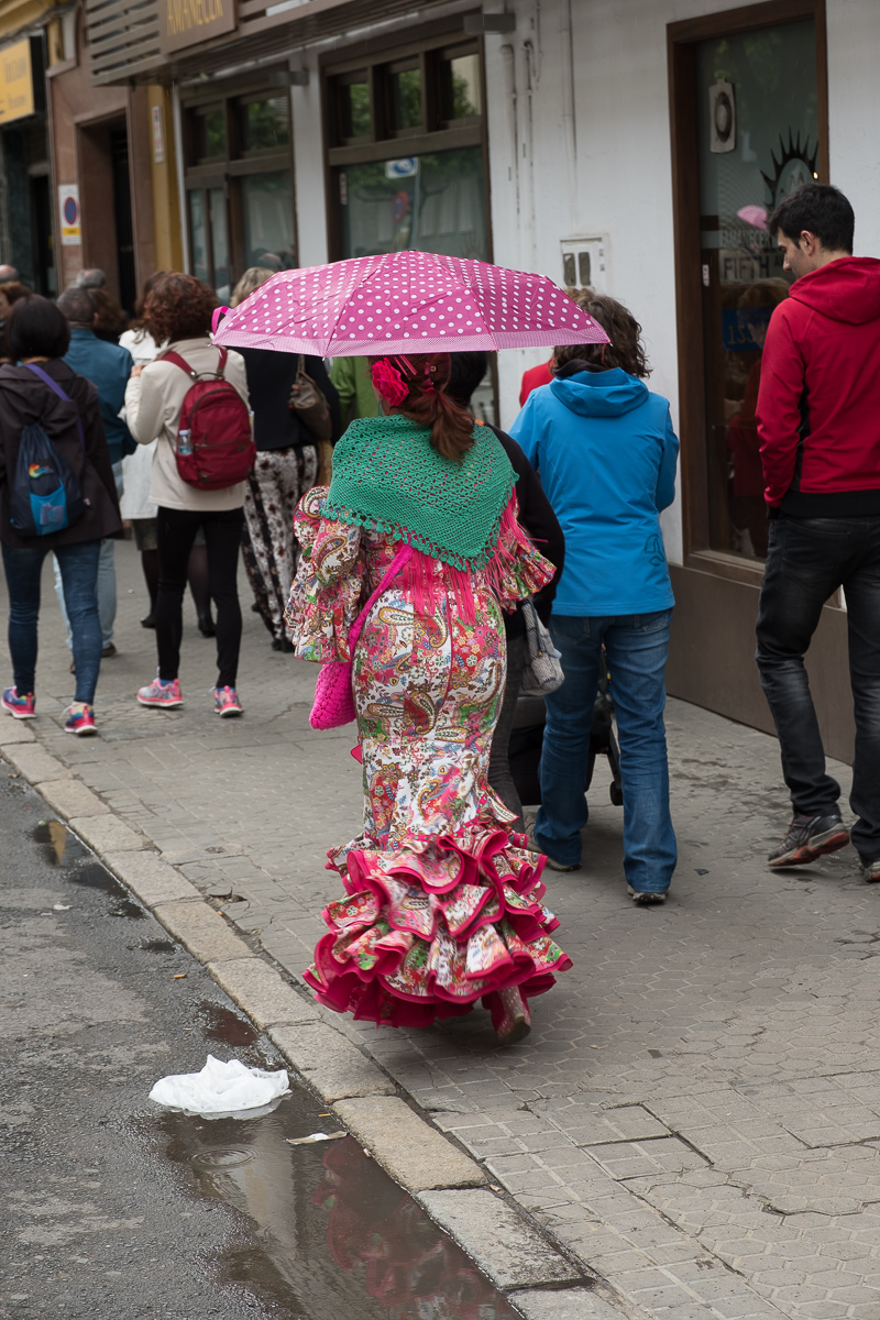 Carriages were everywhere, most drivers wearing dark green rain suits to keep their costumes dry. Not so many individual riders, no doubt due to the rain. Women in every color of traditional dress dodging puddles under umbrellas, playing with their cell phones. The action in the casetas was picking up steam with music and food and lots of cigarettes. People dancing, people chatting. We made a couple of big loops on some random streets taking lots of photos and finally deciding that after a while, the sensory overload makes it all seem the same. Vivid, but unchanging. We left the park and took a different route back to our Barrio through the gardens of the Parque Maria Luisa and up Constitución once again.