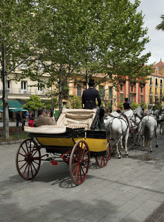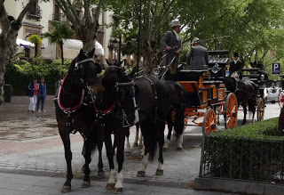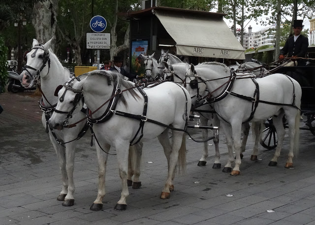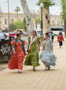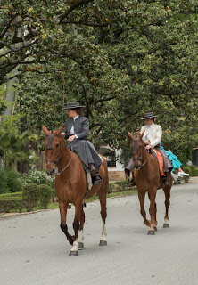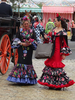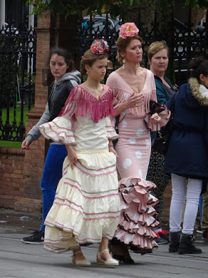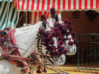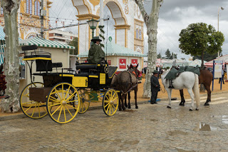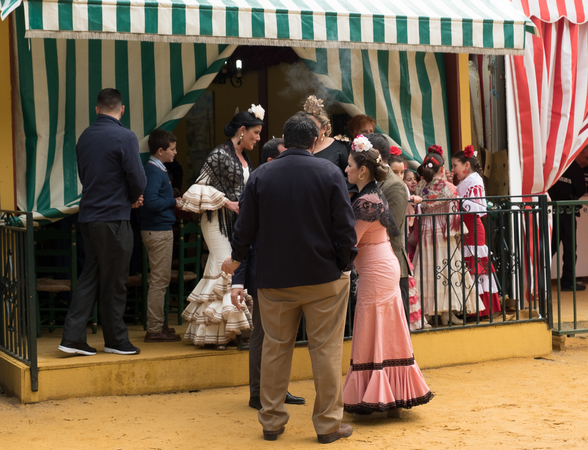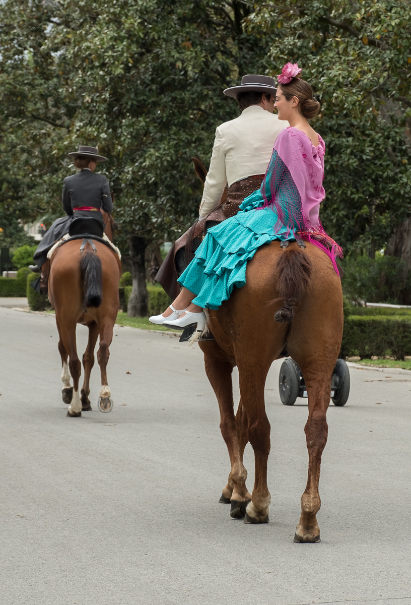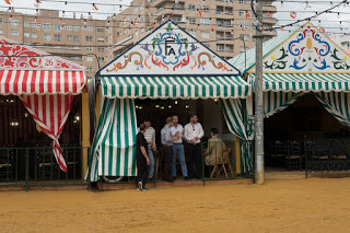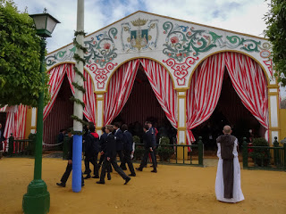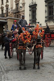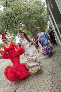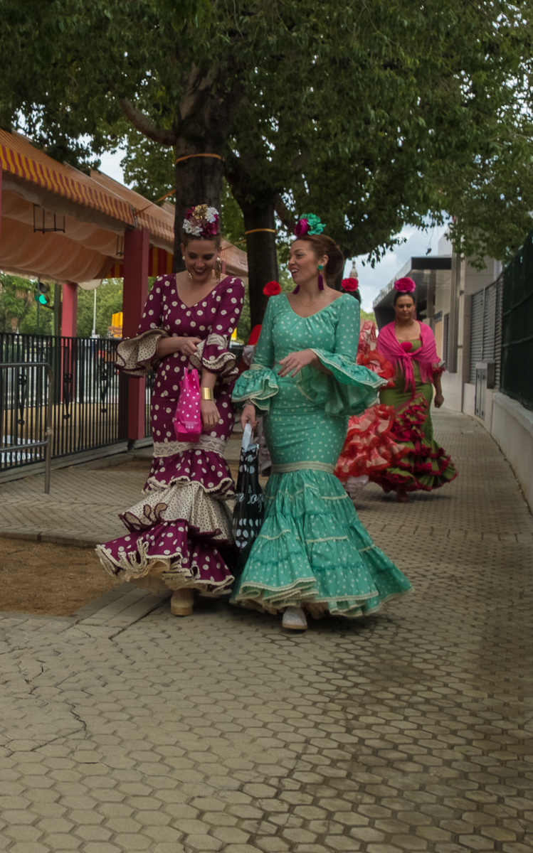 Carriages were everywhere, most drivers wearing dark green rain suits to keep their costumes dry. Not so many individual riders, no doubt due to the rain. Women in every color of traditional dress dodging puddles under umbrellas, playing with their cell phones. The action in the casetas was picking up steam with music and food and lots of cigarettes. People dancing, people chatting. We made a couple of big loops on some random streets taking lots of photos and finally deciding that after a while, the sensory overload makes it all seem the same. Vivid, but unchanging. We left the park and took a different route back to our Barrio through the gardens of the Parque Maria Luisa and up Constitución once again.