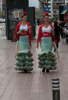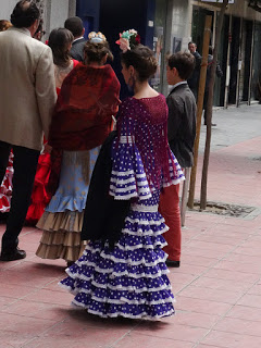 Looks are deceptive – the beautiful arched entry seemed just up the block, but our endless walking told the real story. But now the streets were filling young men in suits escorting their dates in Flamenca finery and so at least the rainy slog was entertaining. Finally arriving we entered and began our paseo up and down the lanes.