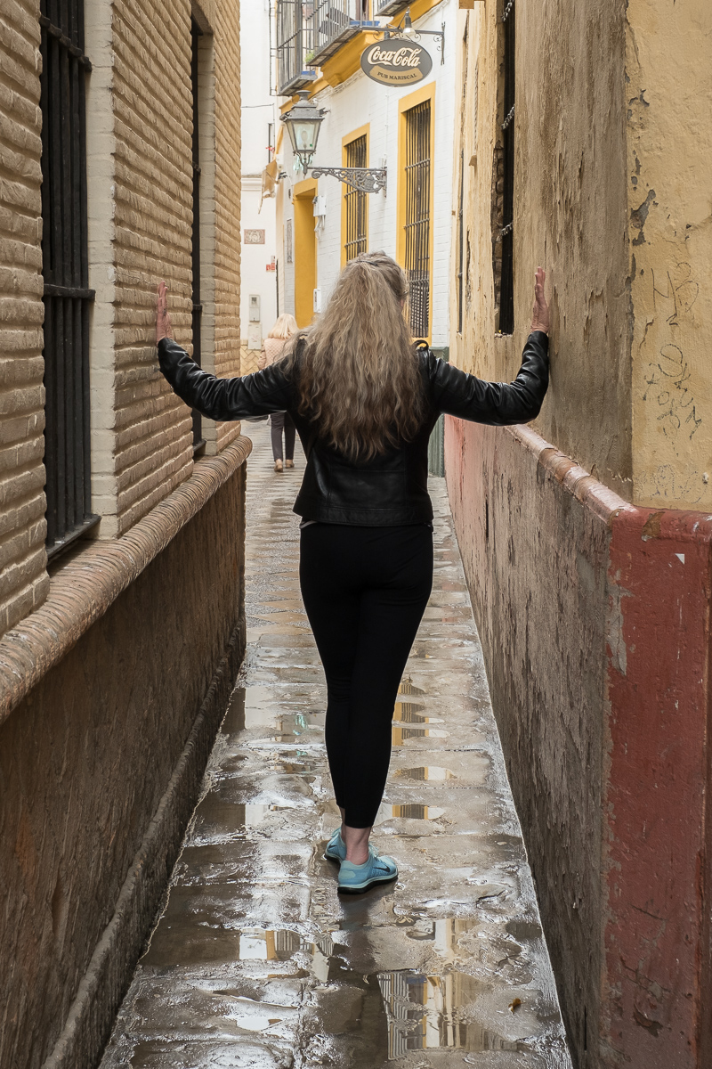 We dropped off our load of goods (he had also given us a very fancy catalog of tile history and a beautiful tote bag (based on a set of tiles from the Alcazar,) we went looking for the skinniest street in Sevilla, one we’d found on a neighborhood walk several years ago. I’d analyzed the photo from back then so I had a reasonable idea where it was and where it led. The photos previous to it in my catalog showed the statue of Don Juan that stands just on the edge of the Barrio, next to an entrance to the Jardines de Murillo. And the exit photo showed a building with yellow and white trim on a sunlit square. So off we went, finding Don Juan immediately but from the where we entered the square there was no obvious skinny street going out. Until we saw it, almost invisible from where we were standing. We went over and recreated our 2013 photo, having to wait first for a mother and daughter scurrying through to avoid the rain and a runner who nodded his thanks allowing his passage.