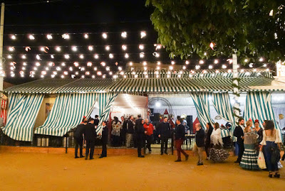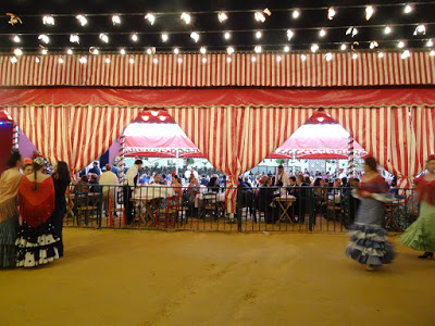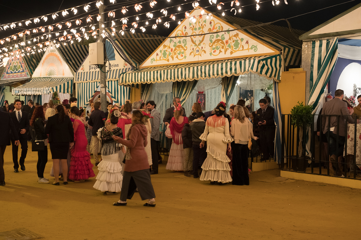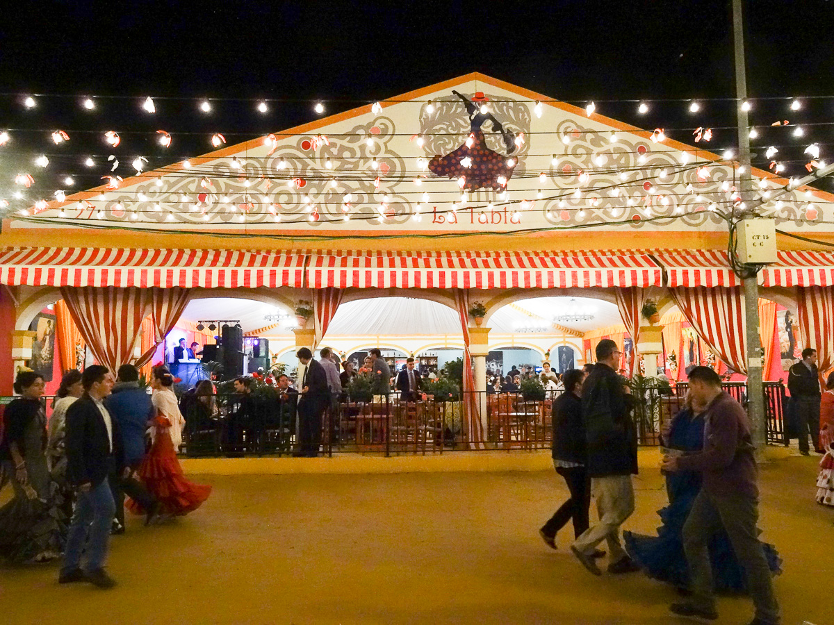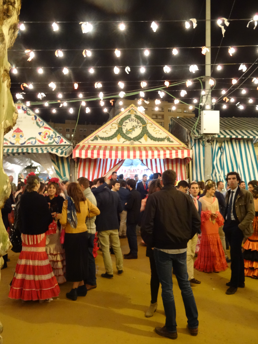 Every single lane, including the main boulevard, was strung with lights, and the casetas were brightly lit by internal lights. Bands of teenaged boys, mostly drunk but not rowdy, were crisscrossing back and forth across the streets. There were bands, and giant video screens, and singing and dancing in each of the casetas, some of which spanned the entire width of their block. Flamenca, Euro-Pop, folk songs everything you can imagine. For lack of a better description, it was like the biggest, rowdiest family wedding you’ve ever been too. Only it was going in in all four directions for as far as the eye could see.