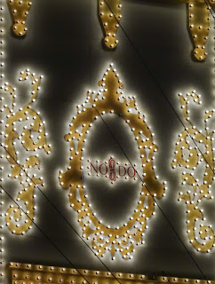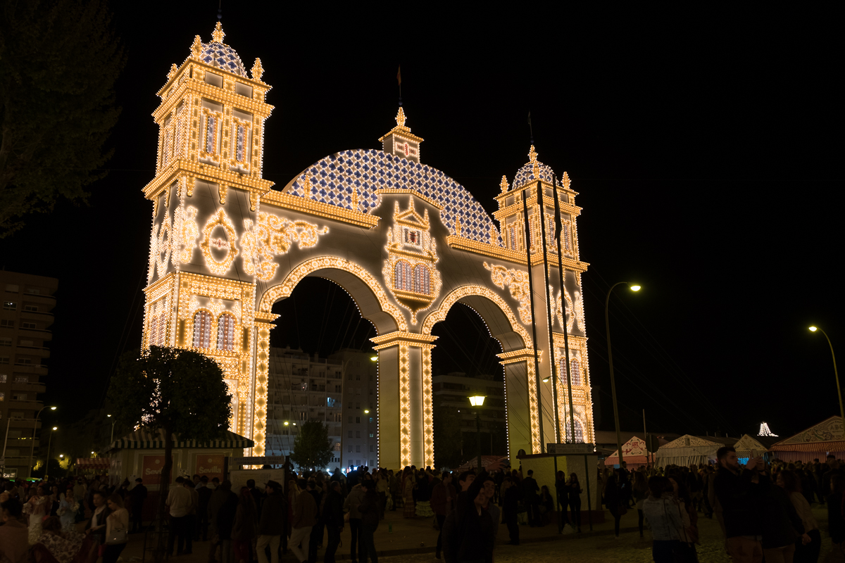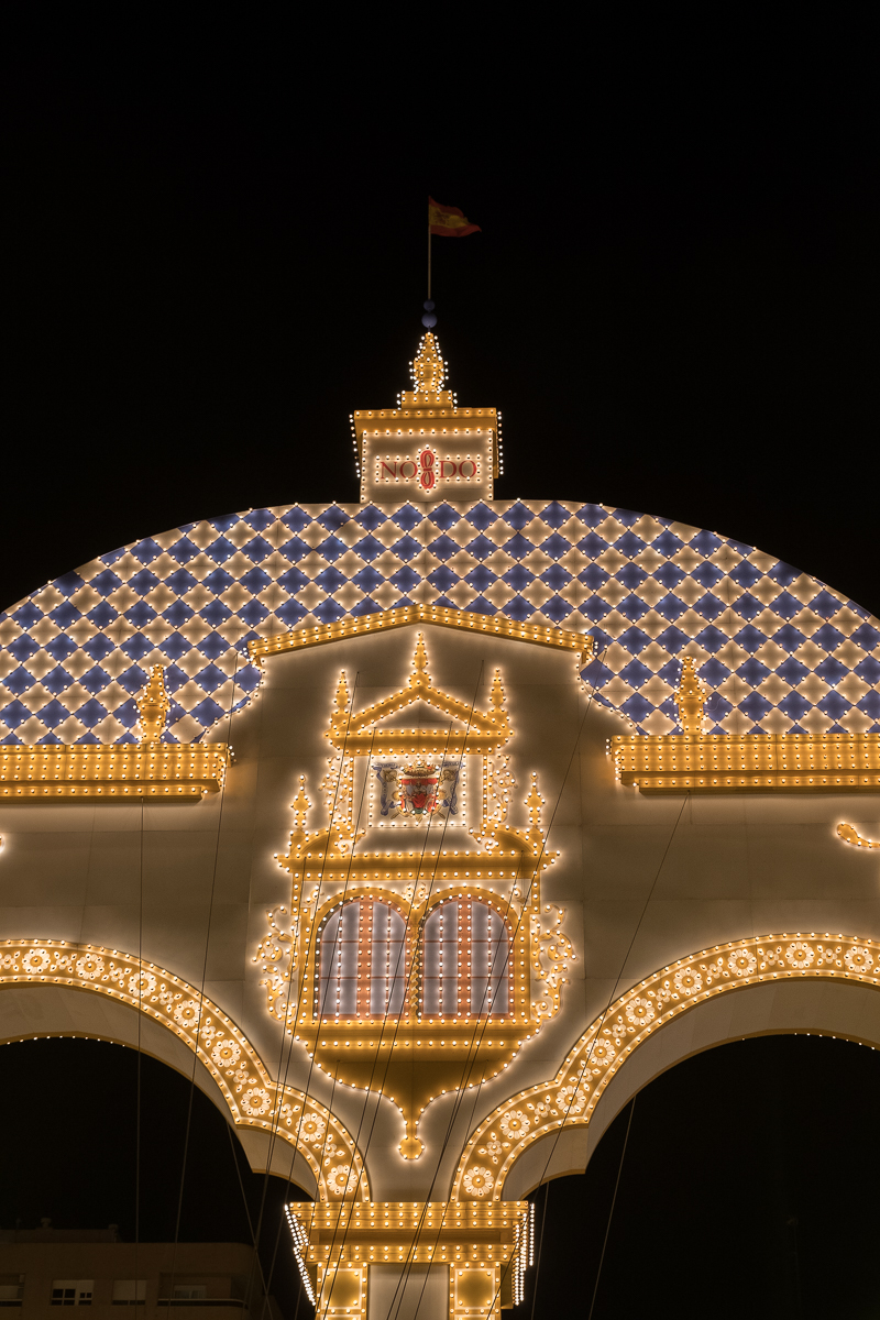When we had walked down to the fair a few hours earlier, the throng of people had grown and grown as we got closer to the gates. Tonight it was even worse – more people walking faster and no one paying attention. Just about everyone was now in full regalia and all the little restaurants along the way were jammed with people eating and drinking, including the only Burger King in the world where all the patrons were dressed in blue suits or Flamenca dresses. Once again the looming gate deceived us by appearing closer that it was, but this time it was illuminated by thousands of little 40 watt light bulbs. The effect was of a giant illuminated gingerbread castle. It reminded me a bit of the Ice Festival in Harbin, only not nearly so cold.