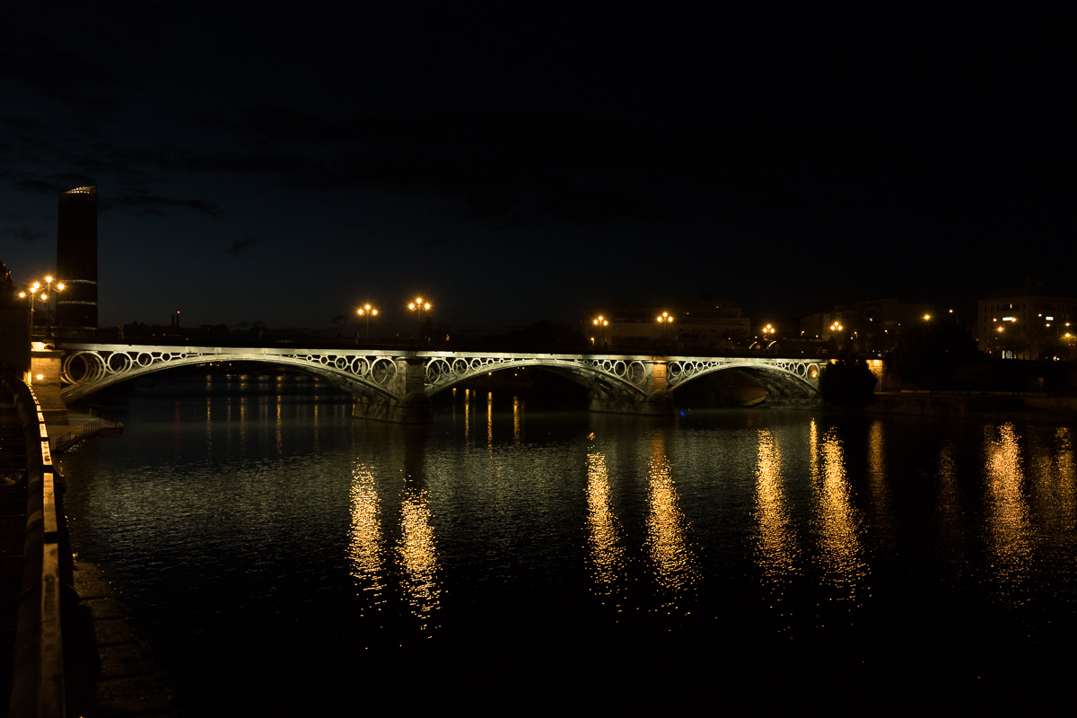 After a long discussion about why there is no cod available (it all goes to the casetas at the fair) and whether or not it was possible to get the fried fish mix without shrimp, and if it’s okay that the non-shrimp components are fried in the same vat as the shrimp, we settled on the racion of fried fish and a tapa of tomato slices with fresh tuna. It took a while for it to show up, but we were in no hurry. Puente Isabel II slowly sank into darkness, only to be illuminated by soft blue light. Four local customers came and sat near us, each smoking but we were saved by being upwind. We ate, ordered the bill and when no one came to collect the money I went over to pay at the actual restaurant.