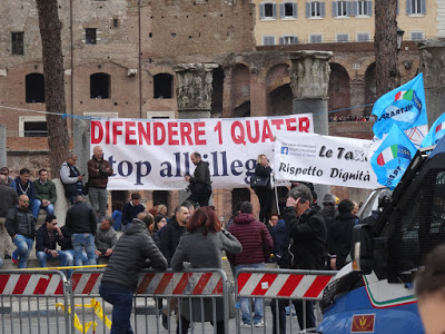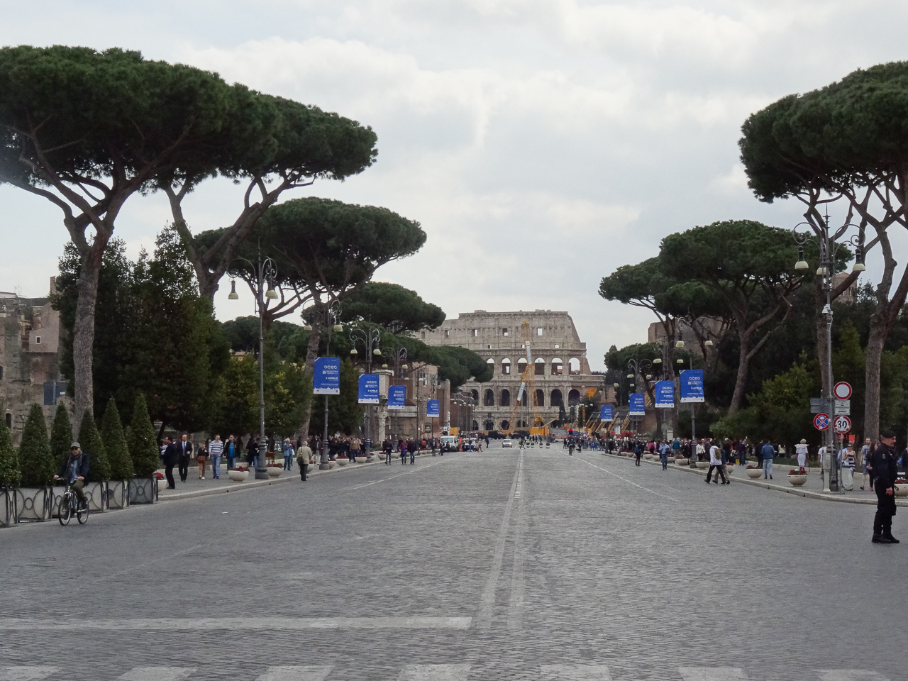 Finally turning on to Via dei Fori Imperiali, we could just spot the Coliseum down at the end. Mussolini himself redecorated this tree line boulevard so he could look out the window in his office in the Palazzo Venezia and stare into the past and Rome’s glory. Today in front of that very palazzo, a group was having a rally decrying illegal immigration, a theme that seems to be chasing us around. Composed almost entirely of young men, the crowd only seemed lightly interested in the speaker’s fiery rhetoric. Surrounded by yellow crime scene tape a few dozen bored policemen, it didn’t appear that their fervor had any chance of erupting into anything.