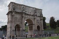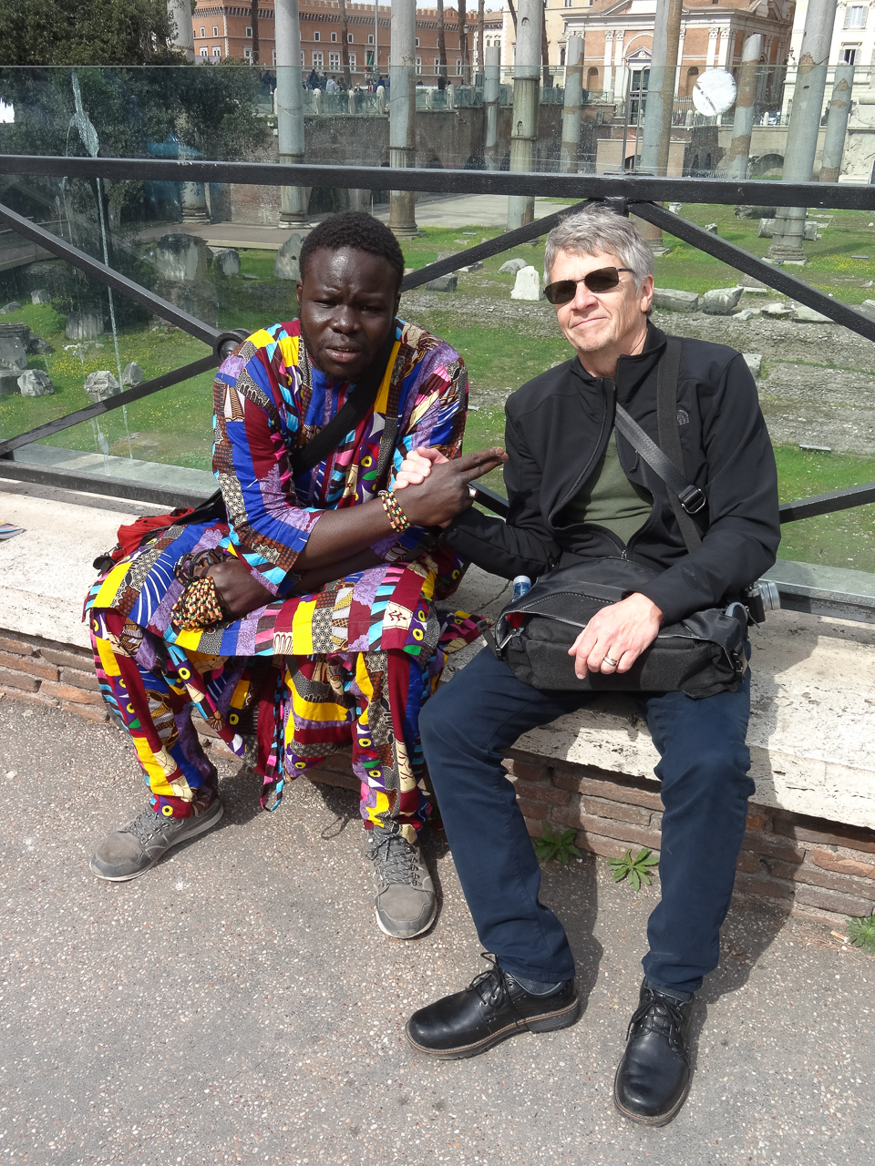 Taking a break on a very nice walkway off the Via we sat and admired Trajan’s Column and Markets, both in nice states of restoration. While there, a street vendor saw us as easy marks and stopped to chat us up. His opening line was interesting, asking to compare the color of his arm and mine and pronouncing us “brothers in tone.” From there he went on about our obvious happiness, the birth yesterday of twin daughters, his country of Senegal and how many languages each of us spoke. He liked us so much that he put leather bracelets on our arms and handed three beaded bracelets for each of our children. After insisting on taking a group photo he handed MLW a molded plastic turtle and me a plastic elephant (just off the boat from Guangzhou not doubt) and explained the significance of those animals in his culture. I knew where this was going, and eventually it got there, as he turned to leave he said, “Sir, do you have a little something for me?” and he appeared genuinely disappointed at the 5 I gave him. Ah well, I’m always willing to have these little cultural encounters as long as they don’t cost too much.