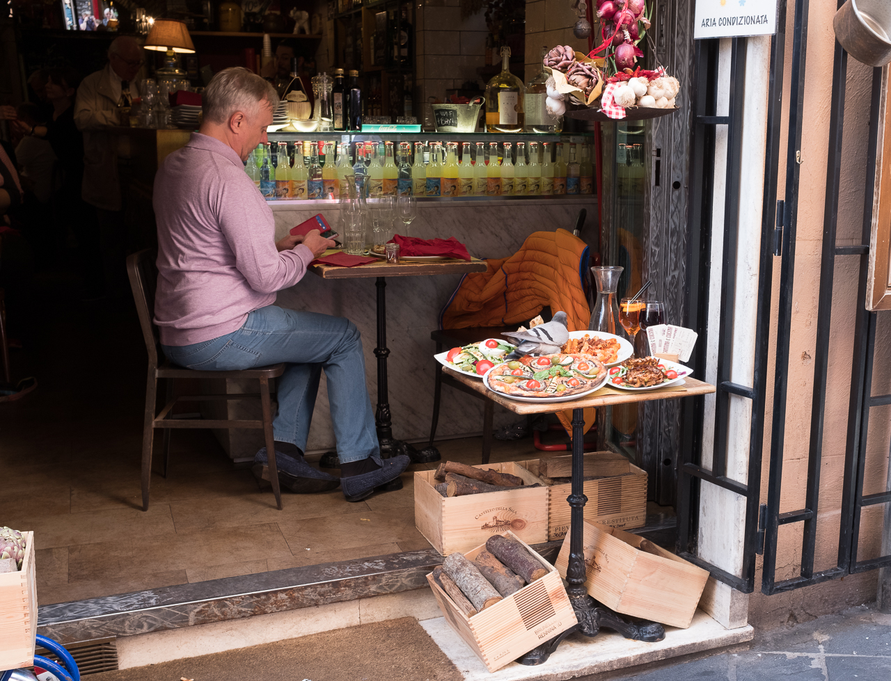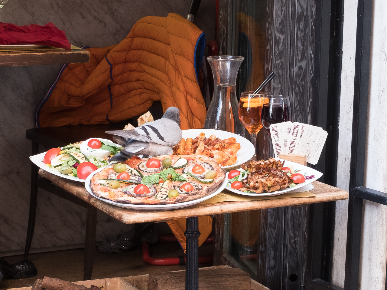 The street side restaurants all put out examples of their wares, made to look freshly prepared and sitting on display in the hot sun with the intention of drawing in customers. I’ve always wondered if the food was real, because leaving real food unprotected and outside might not be the best idea in a crowded city. Well, today my question was answered – a wonderful Rock Dove grazing on a freshly baked Margherita Pizza while diners sat nearby, blissfully ignorant of their companion.
