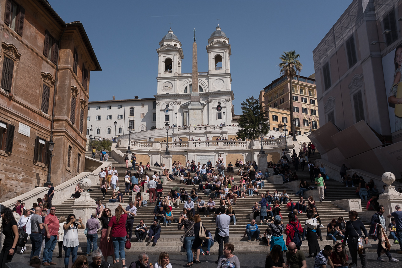 The Spanish Steps were built in 1725 with funds bequeathed by a French diplomat. They link the former Bourbon Spanish Embassy and the Trinita dei Monti Church (above) with the Holy See, originally located in a palace below. Today they serve as an entrance to the Villa Borghese Gardens and as a place for tens of thousands of tourists to sit around. Much like the Trevi Fountain in the latter regard. The Steps are another one of those places that you make a point to go and see and check off whatever list you happen to be keeping.