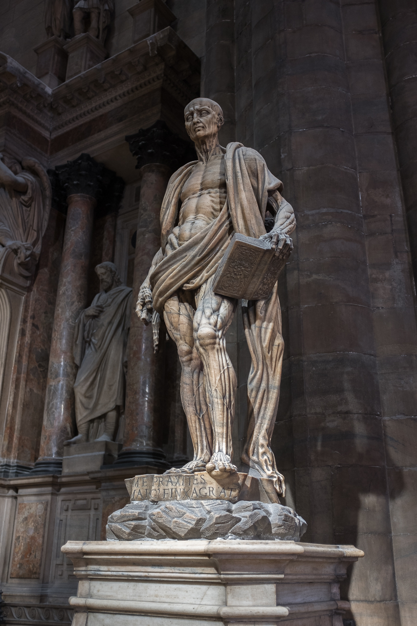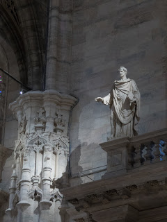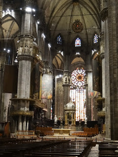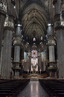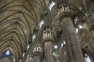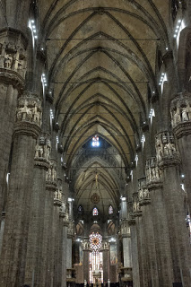 The Duomo is the 5th largest church in the world, with nearly 120,000 sq. ft. Construction began in 1386 Rayonnant Gothic style, one more typically known for churches in France. Work continued for the next 300 years, ebbing and flowing depending on the tastes and preferences of whichever Bishop happened to be in charge. The ornate façade was finally completed in 1812 at the behest of Napoleon who had been crowned King of Italy in 1805. From there, details and refinements continued until 1965 when the last gate was completed. In all, nearly 600 years and 78 architects. It is 515 ft. long and 108 ft. wide across the nave and 302 ft. wide at the transept. There nave columns are 80 ft. tall. The crypt of St. Charles Borromeo is in the basement. Among the priceless statuary is St. Bartholomew Flayed, a life-size full body sculpture of the poor saint with his skin draped over his shoulders like a cape. The roof is home to 135 spires, 96 gargoyles and 2,245 individual statues. The church can hold 40,000 people. The tallest spire is home to La Madonnina, patron of the church and constructed of gilded copper panels on an ironwork frame. There is a nice copy of her inside the church.