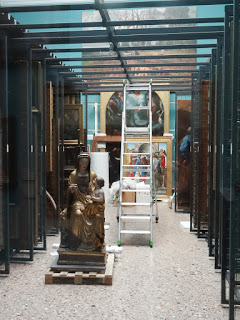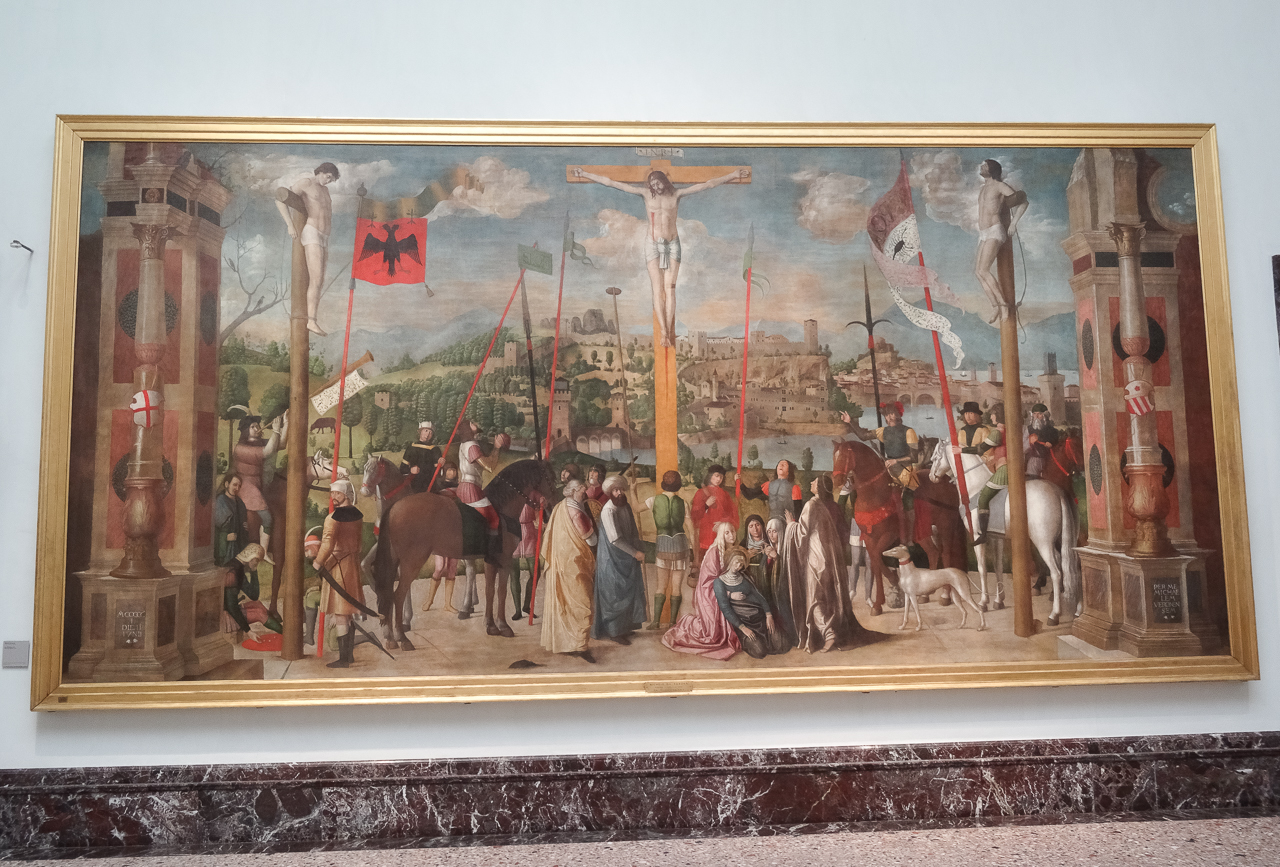 Stop two was the Pinacoteca Brera. Housed in a Baroque palace that was built on the site of a 14th century Jesuit convent. Empress Maria Theresa evicted the Jesuits and converted the buildings to an art museum in 1773. The gallery officially opened in 1809, stocked with art work conscripted from churches and convents by Napoleon during his Italian Campaigns. His stated goal was to make the museum “The Louvre of Italy.” And he largely succeeded, it’s a wonderful place, albeit not a crushingly large as the one in Paris. The emphasis is on works from the 14th to 18th centuries, with (as expected considering the source of most of it) religious art. There are many extraordinary pieces including a wonderful Caravaggio. I liked it for two reasons – the detailed documentation of each major piece was accompanied by an interpretive description that expanded on the technical details with commentary about what you might be looking at. Secondly, like the Louvre, the map had all the major pieces listed on one side with an image, so you would have no excuse to visit and leave and later realize you had misses something important. The navigation was easy, the collection vast and the arrangement of the works followed a time order. Perhaps my favorite part though were the two storage rooms that held works not on display. Two big glass-fronted alcoves stuffed with racks holding hundreds of masterworks. I suppose we all know that every museum has a basement full of stuff, but it was very cool to finally see one.