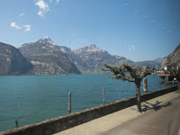 The scenery beyond Como was spectacular. Italy slowly changes to Switzerland as the miles tick by, and Alps start to appear on both sides of the line, framed by beautiful glacial lakes. I like Como, but I liked Lugano and Bellinzona ever more. Little by little the merged zone gives way and Switzerland takes charge – broad green valleys with tiny chateaus clinging to the sides of the hills. Down below, wooden barns with tall peaked roofs surrounded by Swiss Brown cows, munching on the grassy meadow. After Italy, which much like Spain looks brown and weedy and parched, these places were positively verdant as well as extraordinarily tidy.