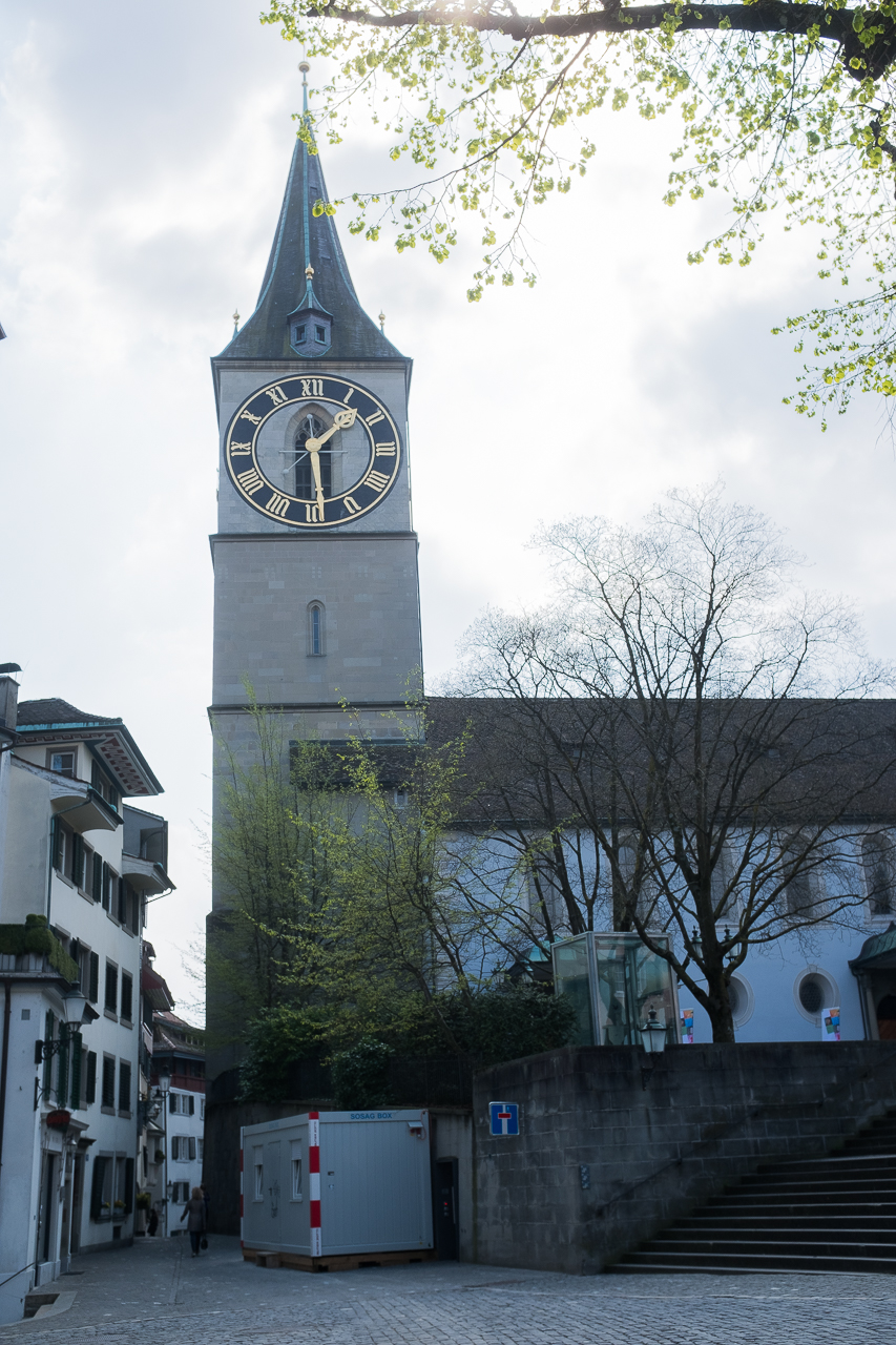 The old part of Zurich is eminently walkable, much like many medieval towns with some steep ups and downs and tons of shops. Less touristic things though, rather upscale boutiques. Also, not a lot of restaurants compared to say, towns like Toledo or Segovia, both of which I thought of as we were wandering about. We visited St. Peter’s church before searching for lunch. It’s an oddball, an 11th century apse attached to an early 18thcentury Baroque nave and a 12th century clock tower featuring a 28’ diameter clock face, the largest church clock face in the world.
