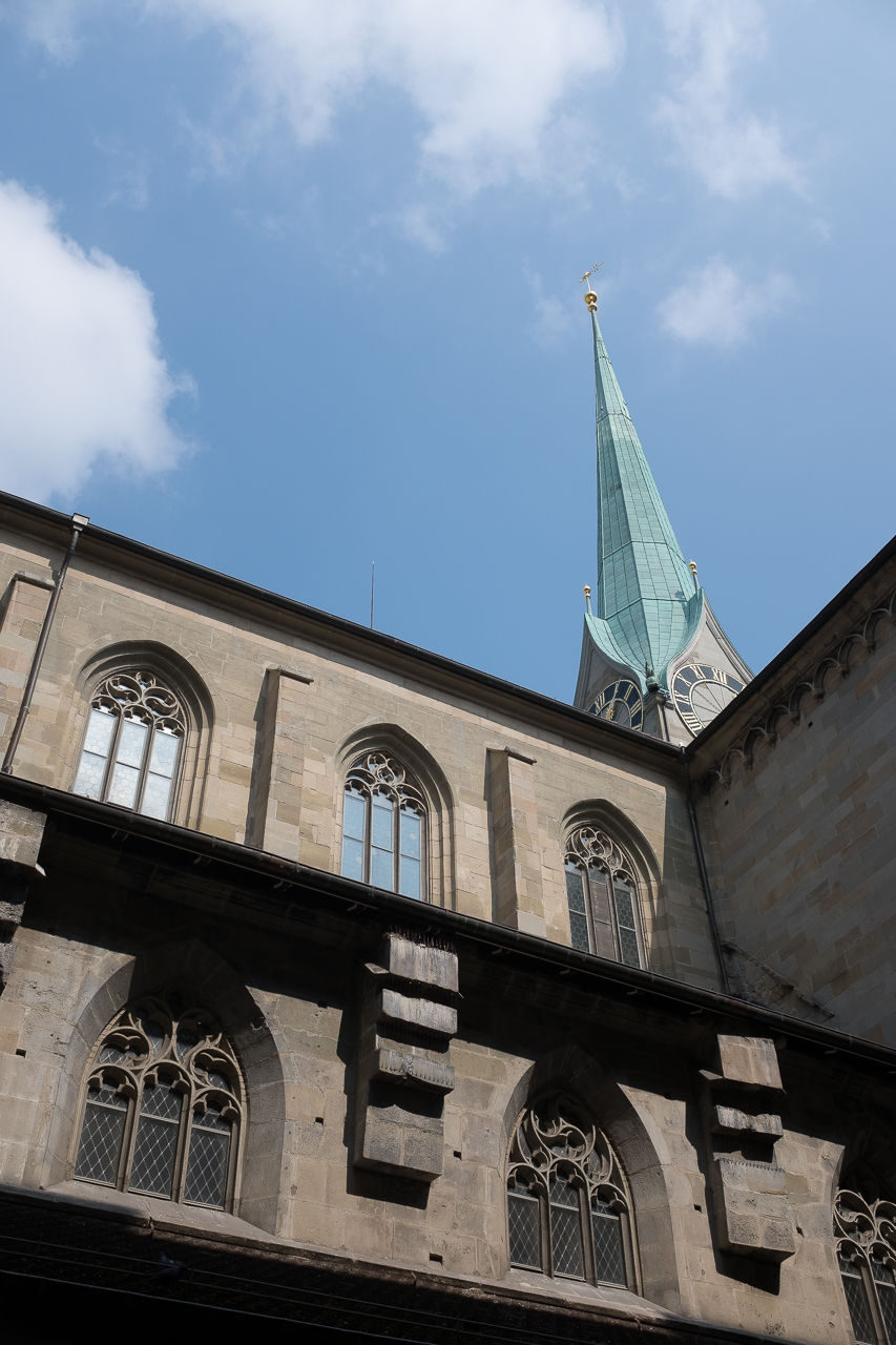 The Wasserkirche, the historic site of Felix and Regula’s martyrdom stands next door, but was closed today so we went on to the Fraumünster. Founded by Charlemagne’s grandson Ludwig, it too shares the clean lines and bright space of its neighbor. Originally a convent, the buildings associated with that function were torn down after the site was deeded to the Reformation church. Featured here are 5 stained glass panels done by the Marc Chagall. There is an excellent interpretive museum in the ancient crypt, with exposed foundations dating to the 9th century. Unfortunately, no inside photos allowed.