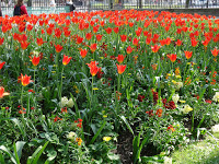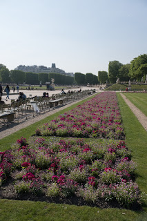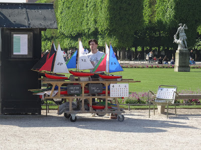 On to the gardens. Our first visit to Paris was in February, and there was nothing to see. Last time it was just a bit too early so we didn’t bother with the long walk. This trip was specifically planned for spring weather, you know, the whole “April in Paris” thing, and our planning was rewarded. The trees were green, the gardens full of tulips and spring flowers and tons of people sitting and enjoying the morning sun. One of the popular things to do here is sailing wooden boats. At 3€50 for 30 minutes, you get a sailboat and a long wooden stick to keep it going. All the action is via wind and it’s very cool to watch the little boats tacking around the pond at the center of the park. You launch, you watch and you run around to start the process again on the other side. I just plain loved watching the kids (and a few adults too) going through their sailing routine. The palace associated with the gardens was built between 1610 and 1627 for the widow of Henry V. The size and the lavishness brought to mind the French Revolution and why the peasants decided to kill all the royalty with such a fury. Imagine Paris in the early 17th century, and imagine this sizable chunk of land devoted to a single window, while everyone else was living in the mud. Not a big hop from acquiescence to pitchforks.