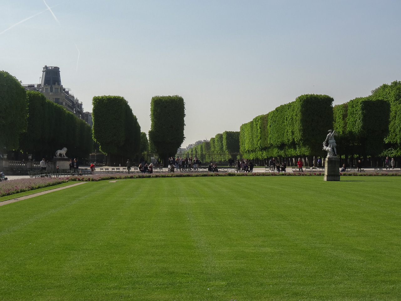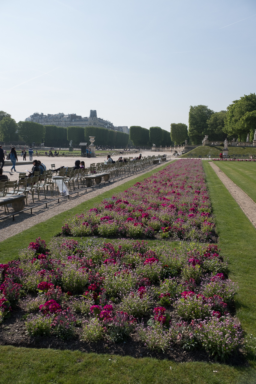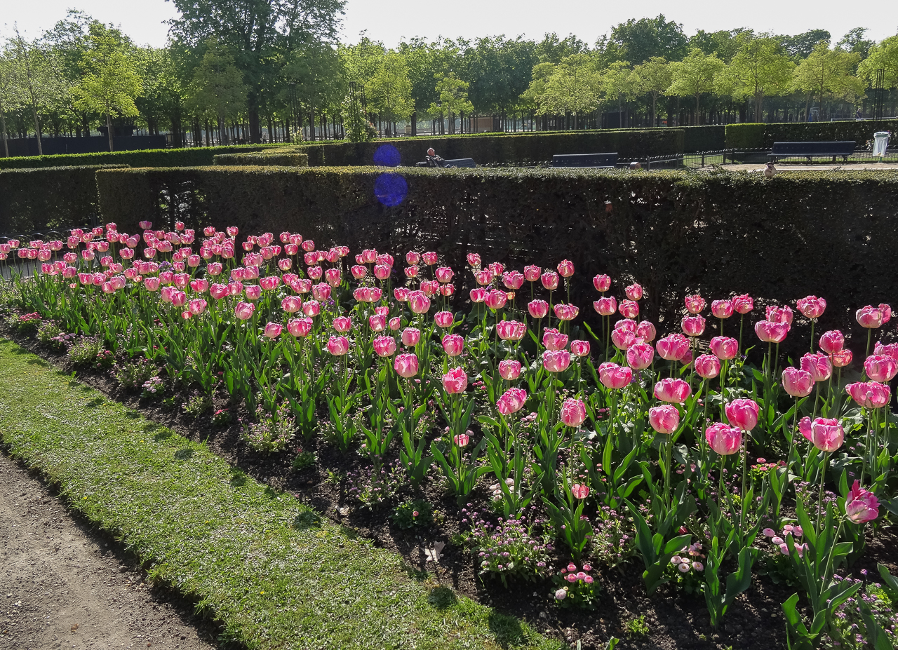 On to the gardens. Our first visit to Paris was in February, and there was nothing to see. Last time it was just a bit too early so we didn’t bother with the long walk. This trip was specifically planned for spring weather, you know, the whole “April in Paris” thing, and our planning was rewarded. The trees were green, the gardens full of tulips and spring flowers and tons of people sitting and enjoying the morning sun. One of the popular things to do here is sailing wooden boats. At 3€50 for 30 minutes, you get a sailboat and a long wooden stick to keep it going. All the action is via wind and it’s very cool to watch the little boats tacking around the pond at the center of the park. You launch, you watch and you run around to start the process again on the other side. I just plain loved watching the kids (and a few adults too) going through their sailing routine. The palace associated with the gardens was built between 1610 and 1627 for the widow of Henry V. The size and the lavishness brought to mind the French Revolution and why the peasants decided to kill all the royalty with such a fury. Imagine Paris in the early 17th century, and imagine this sizable chunk of land devoted to a single window, while everyone else was living in the mud. Not a big hop from acquiescence to pitchforks.