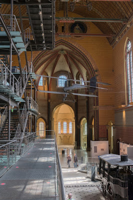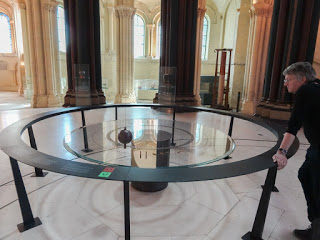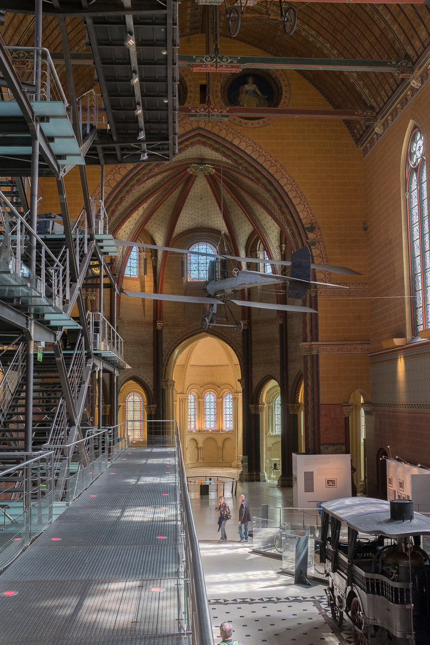 We spent at least 3 hours, and we could go back and spend a day in every single room. The route starts at the top of the building and winds its way down, ending up in the priory of the church which was cleaned up and remodeled in 1990. The stained glass is a nice as any of the local monuments and the interior has been partly painted in bright colors to liven it up. The original unadorned apse is to one side, with a reproduction of Foucault’s original pendulum in the center. The version today in the Pantheon is a reproduction of his first, a 28-kilogram lead ball covered in brass. That one was moved here in 1855 where it swung until 2010 when its cable snapped and it was destroyed by its fall to the floor. The nave holds a large metal structure that you climb to encounter some automobiles and a nice reproduction of the Statue of Liberty. In one corner stands a rocket motor, hanging from the ceiling are three famous airplanes from the dawn of flight (including the Bleriot.) Lighting is provided by the sun shining through the stained glass. It’s a museum devoted to machines, that feels like a church devoted to the same.
