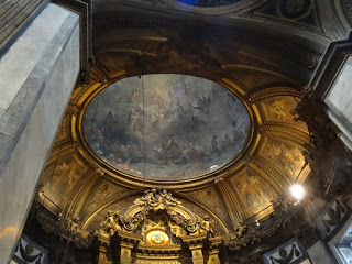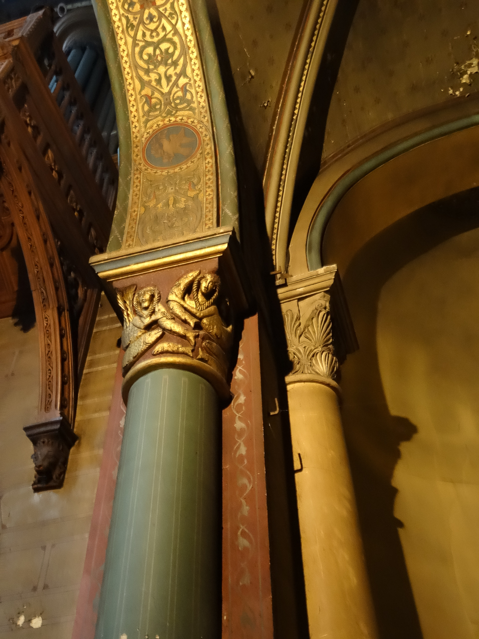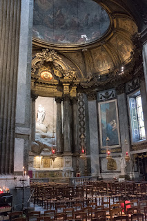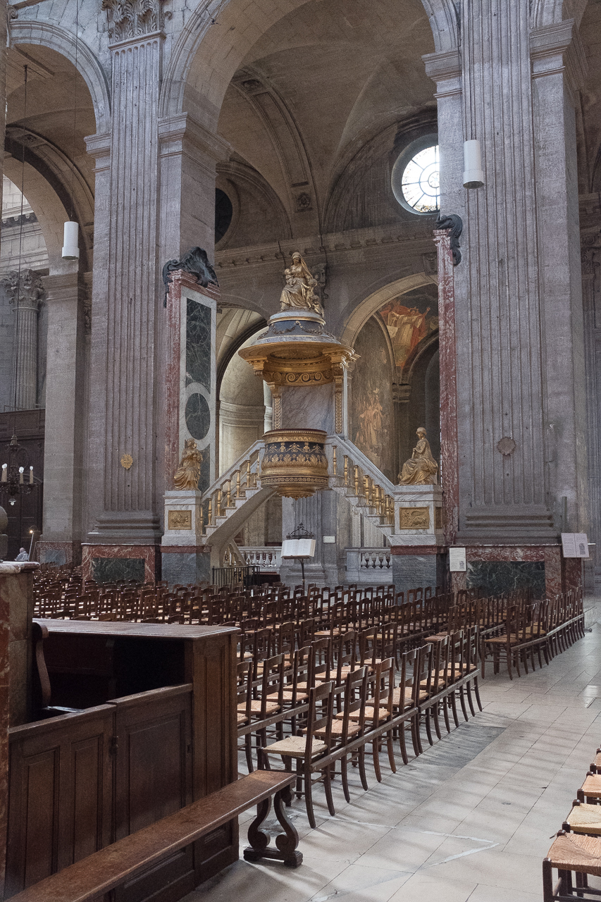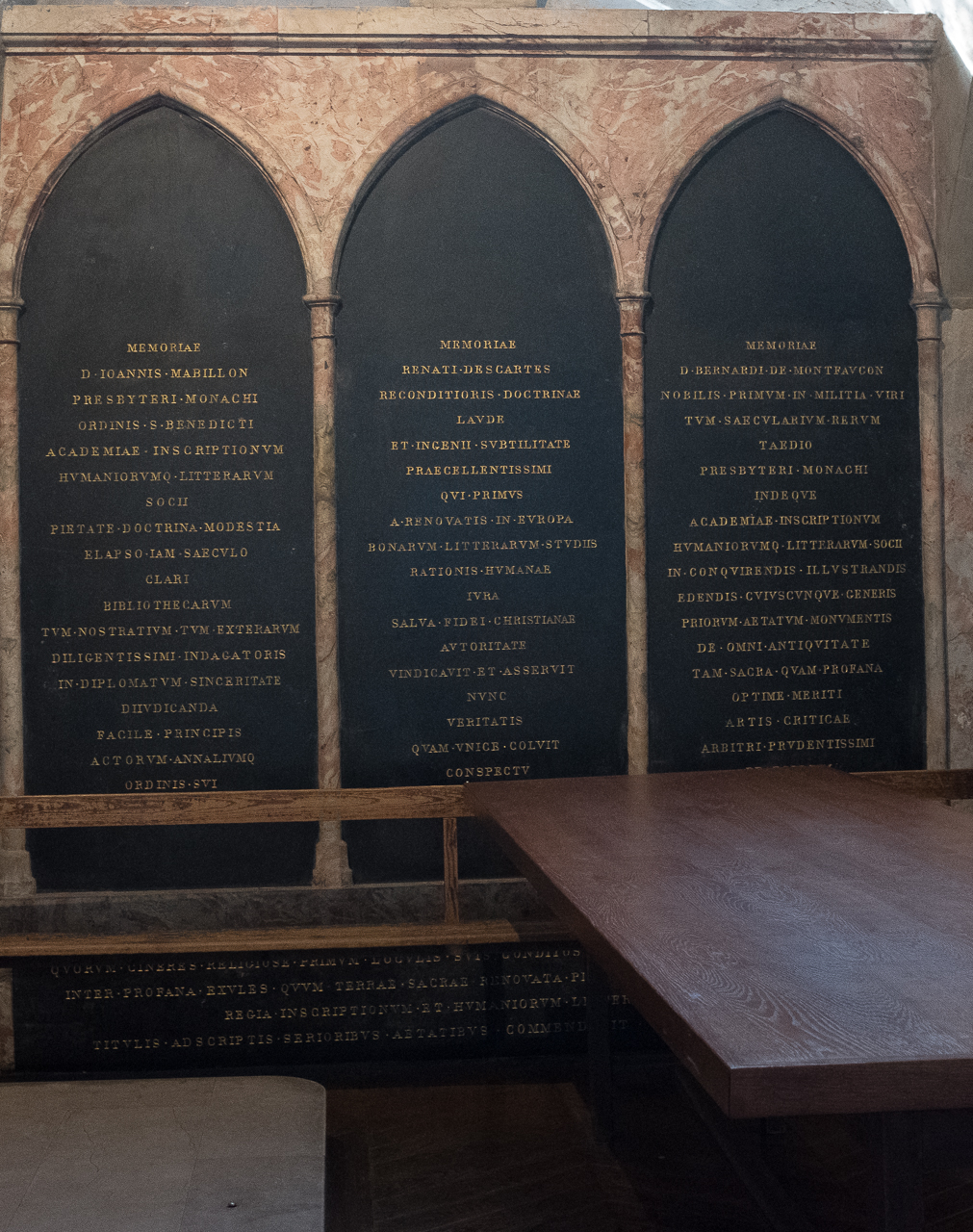 I tried to visit in 2014 but it was closed due to renovation. Today it was open but large sections remained behind scaffolding and tarps. Nonetheless, the little array of chapels (a unique feature of the church, the western halves of both sides of the nave and the entire apse are ringed with them.) The heart of Jean-Casmir, King of Poland is interred in the Chapel of Saint-Francis Xavier and we were able to visit the tomb of the great philosopher (“I think therefore I am”) Rene Descartes in the Chapel of Saint Benedict. That chapel was stuffed with a bunch of non-religious junk, being stored there due to the construction, no doubt. Somehow, I think Descartes would feel diminished. Another unique feature is the medieval decorative paint on many of the columns and capitals. It was quite striking.