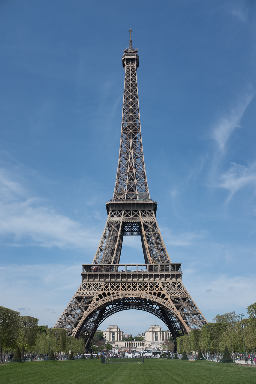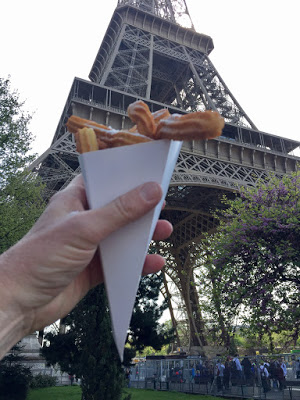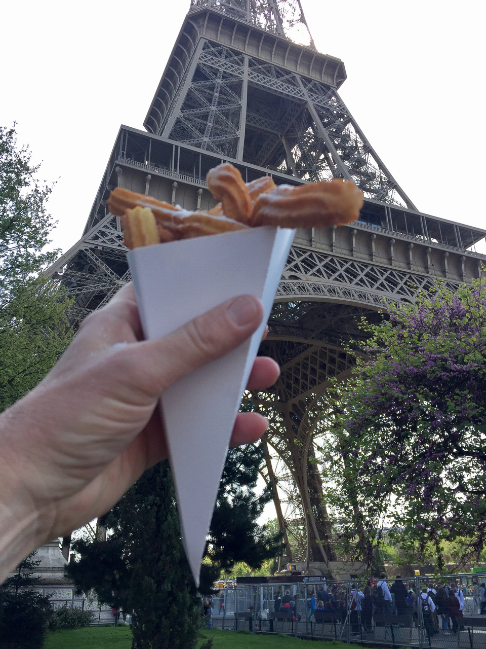 On to the Tower and those elusive churros. Returning to ground level at the Trocadero, that massive pile of stone across the river, we found the place mobbed. We went down the hill and found the churro guy who seemed to be in a bad mood judging from the way he snapped the head off the teenager in front of me who wanted ice cream and not churros. I was all too happy to take her order and he was even happier to take my 5€. I stopped and took my traditional churro-tower photo just below the tower’s massive leg.