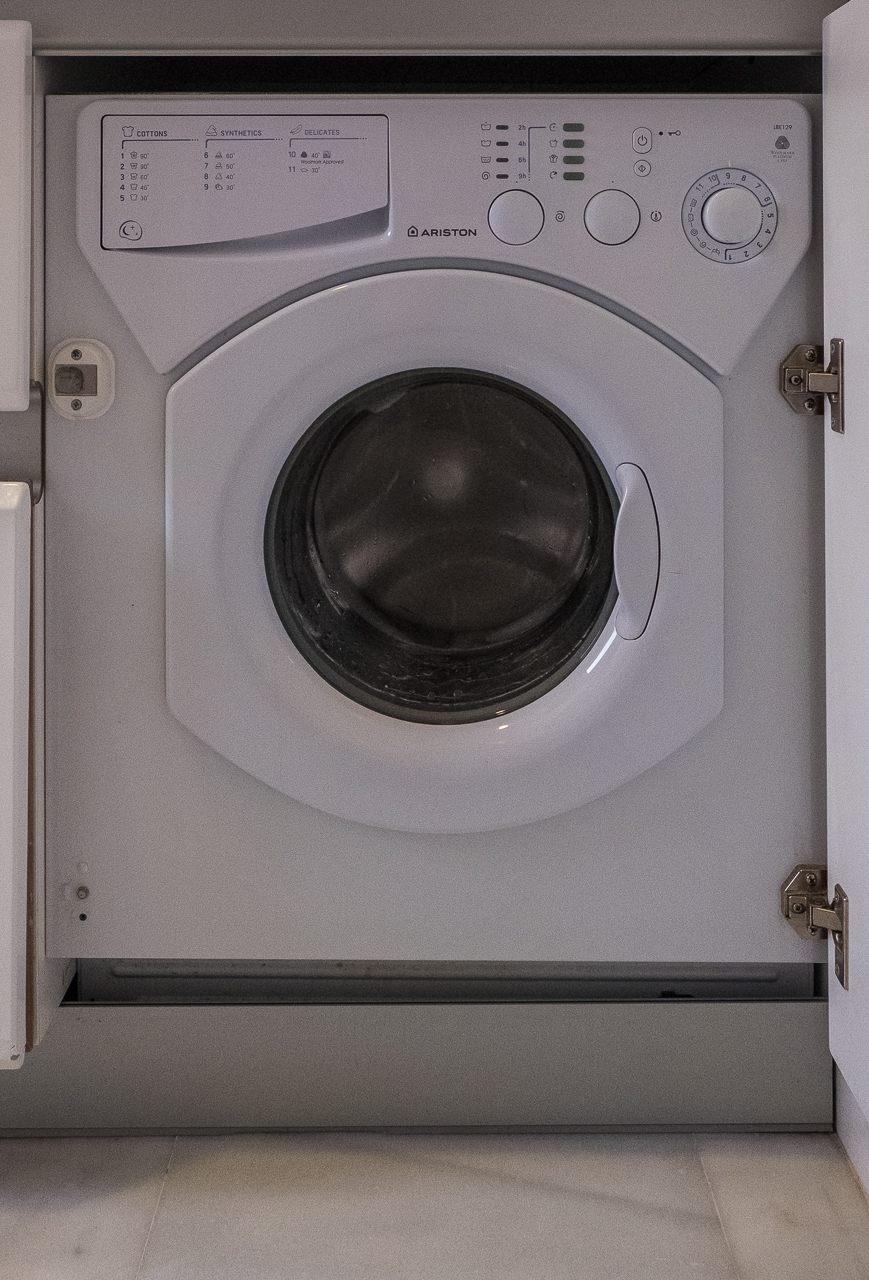 Another apartment in Madrid, know to us as “The Garret” due to the severely sloping ceilings, had the washer in the kitchen, and because of said ceilings, it could only be accessed by crawling across the floor. Its cousin lived in Granada, and it was in a tiny closet in the attic, again only accessible by hands and knees.