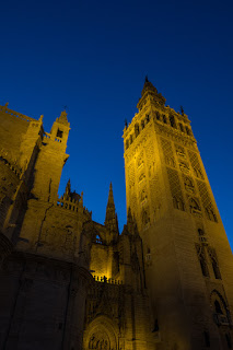 We had a half-hour to kill so we took a long promenade around the cathedral, stopping to look in the always-open side door to the orange tree garden. A common feature in al-Andalus mosques, where the Caliph would roam in quiet contemplation of the wonders of the world, these enclosed gardens were often kept when the Christians ran off the pagans and dropped a giant cathedral down on top of what was already there. I took a photo through the bars just as two Kestrels began lazy circles across the garden and up the tower, no doubt thinking about a late-night aperitif of pigeon al fresco. We killed a few more minutes watching people from the stone bench in the cathedral square and then went on to the restaurant.