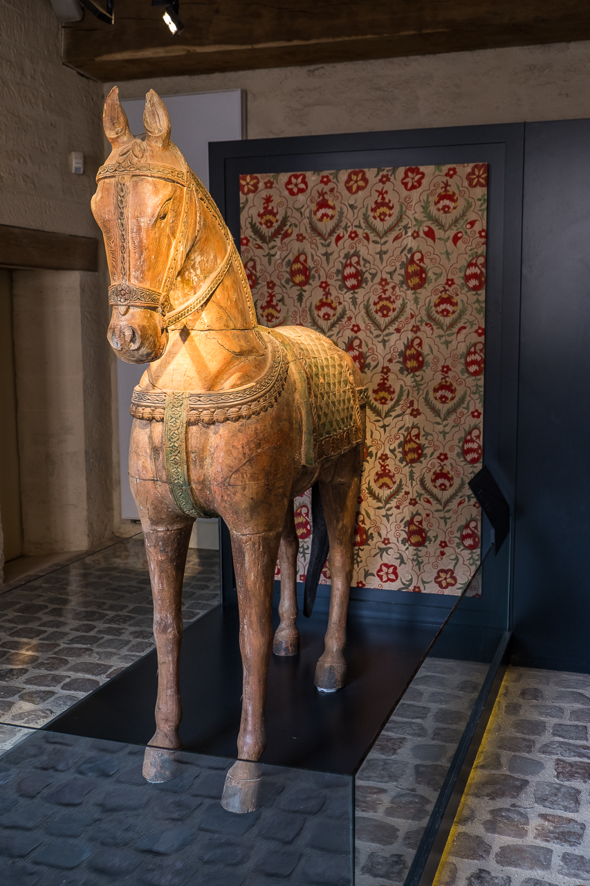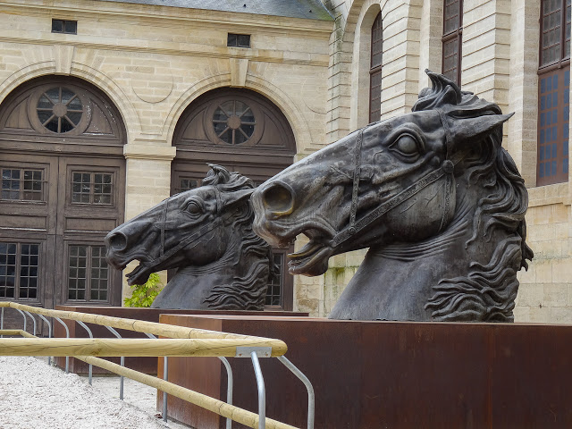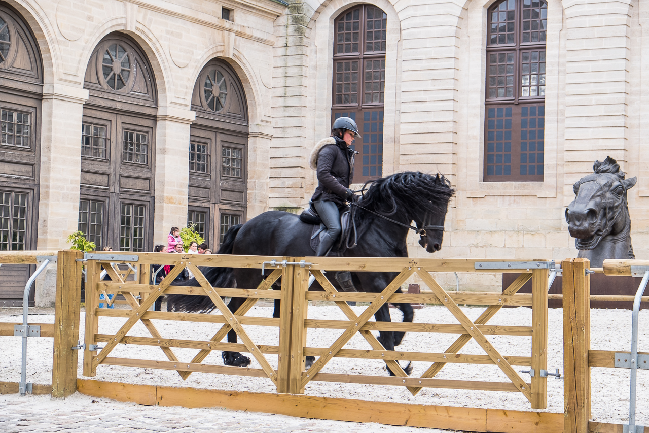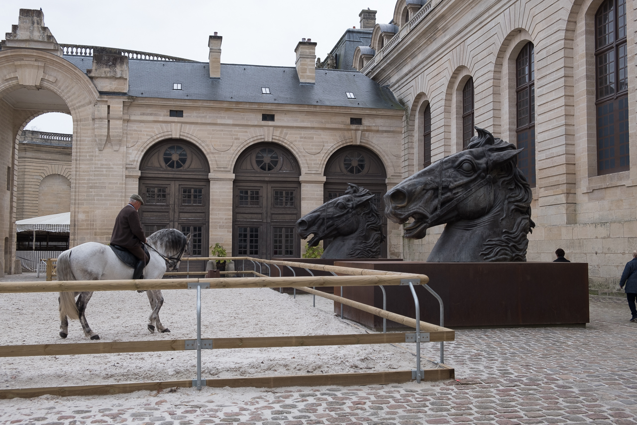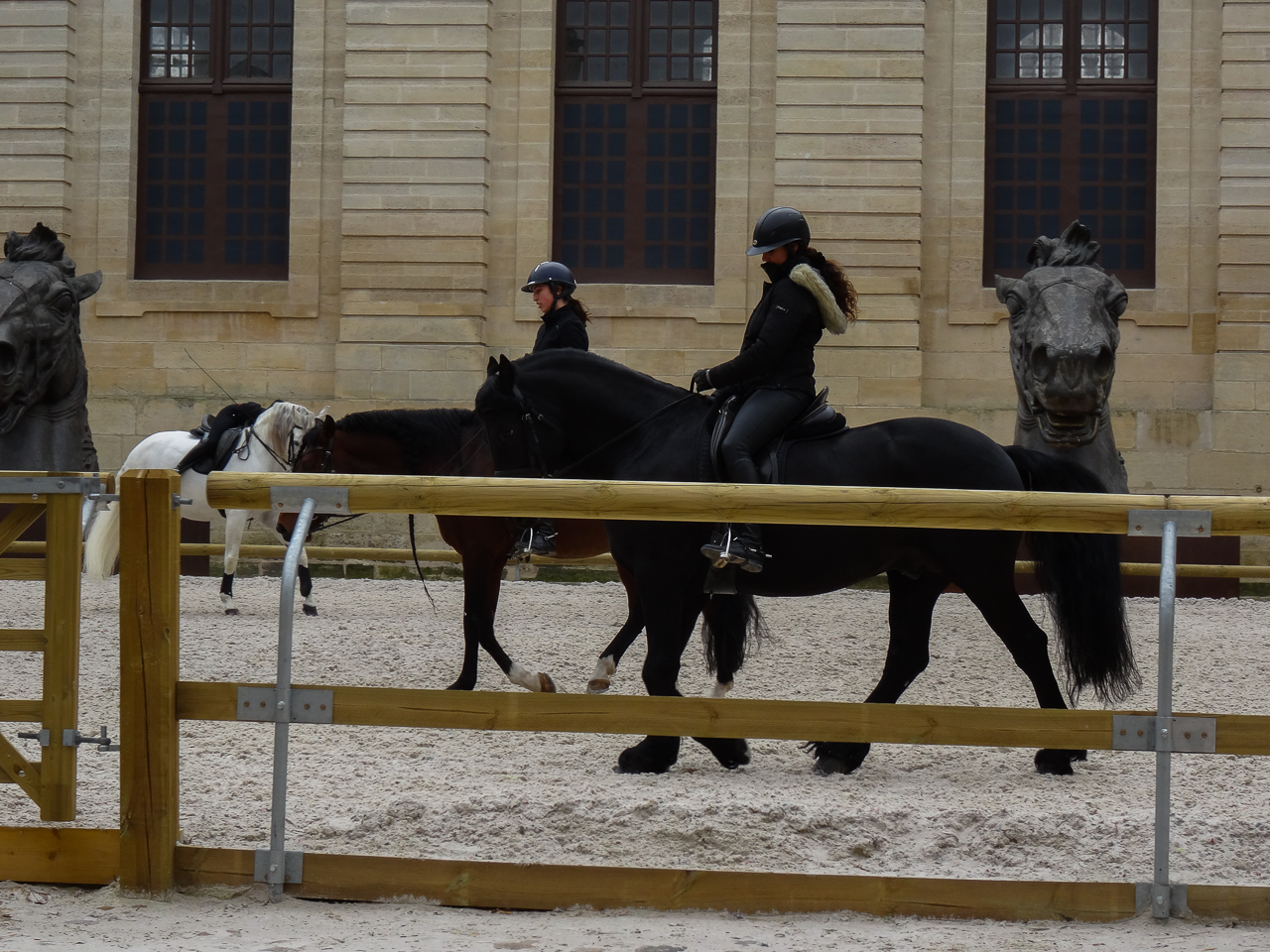 The stable houses Le Musée de Cheval, a very well designed and executed tribute to the horse. We were really spoiled by the last two museums in Portugal, and this one continued the winning streak. You enter through one of the main stable doors into an actual working facility full of horses. , right up the barn row .An interesting bunch – a Friesian, a Lusitano or two, some PREs, several Shetland Ponies, a couple of minis and even 3 burros. As it turned out, this bunch was the cast for the show they put on later in the afternoon. From there you travel through 15 well-appointed rooms, housed in the old stables, filled with displays and multi-media depicting the human interaction with equines from antiquity to the modern. A very nice collection well-presented and highly interactive. We were lucky as it turns out because after our walk from the Chantilly station we chose to stop first here rather than go on to the much more famous chateau. Since it was only 12:00, and the show was not until 2:30, most people make their visit in the other order. The result – we had it all to ourselves.