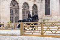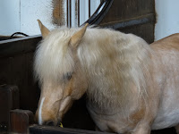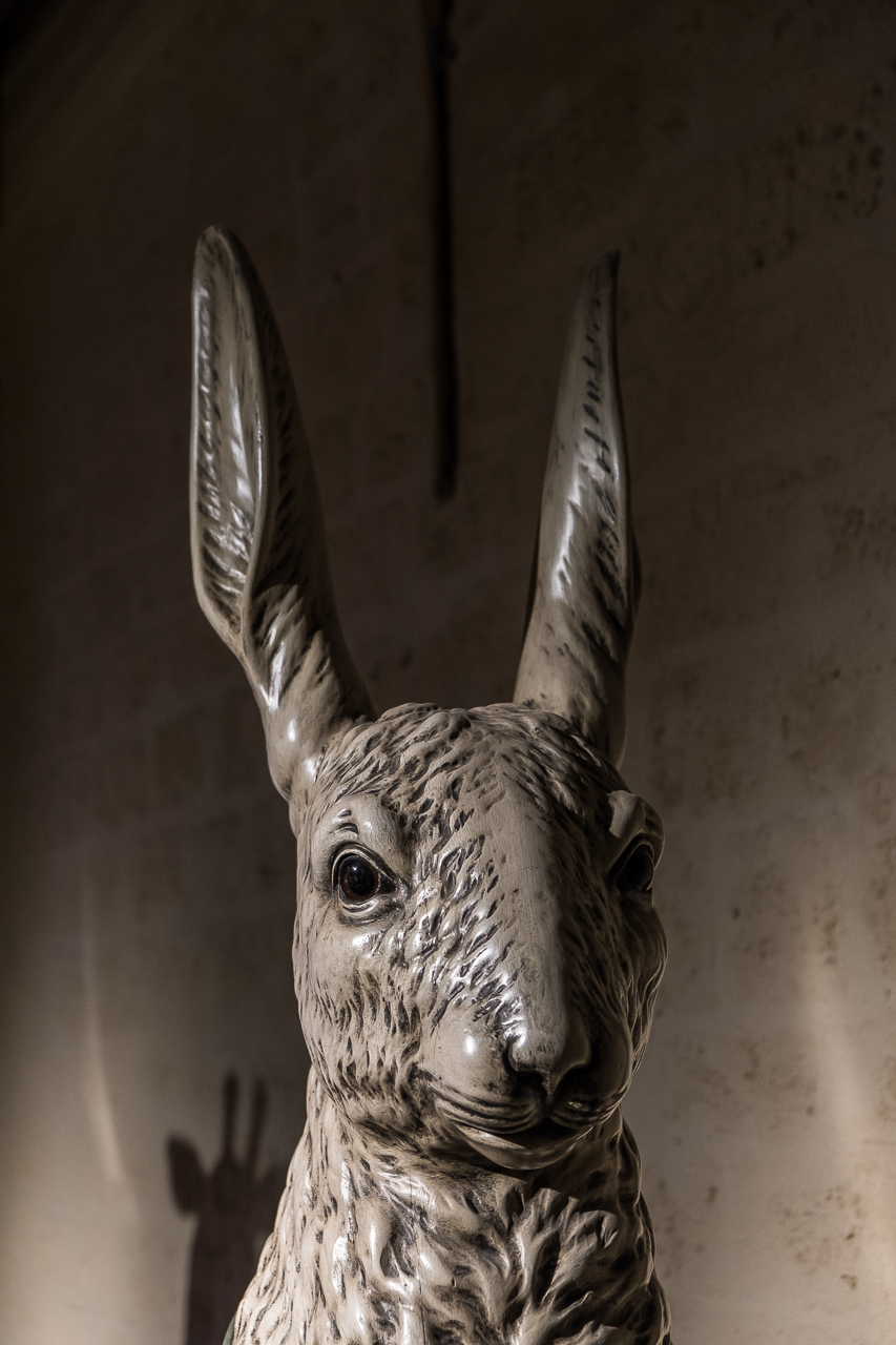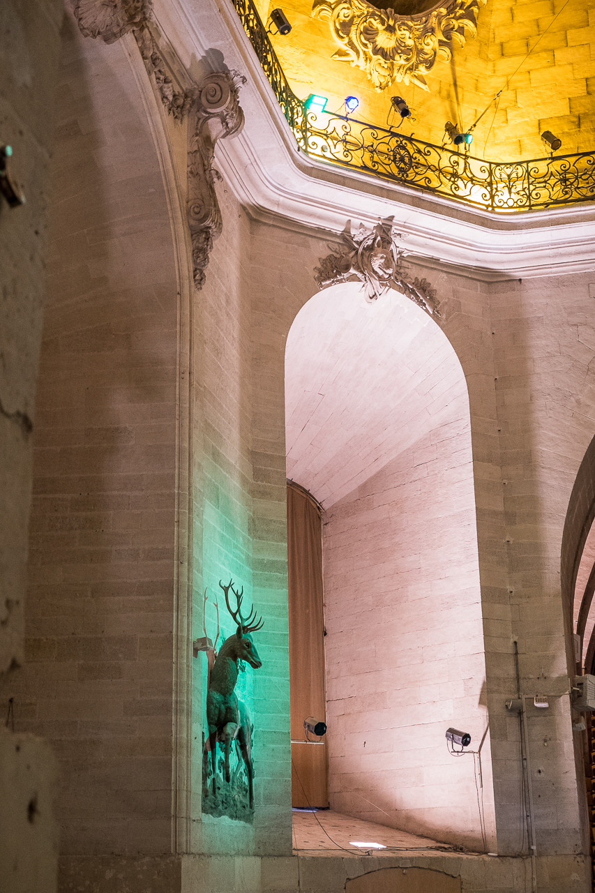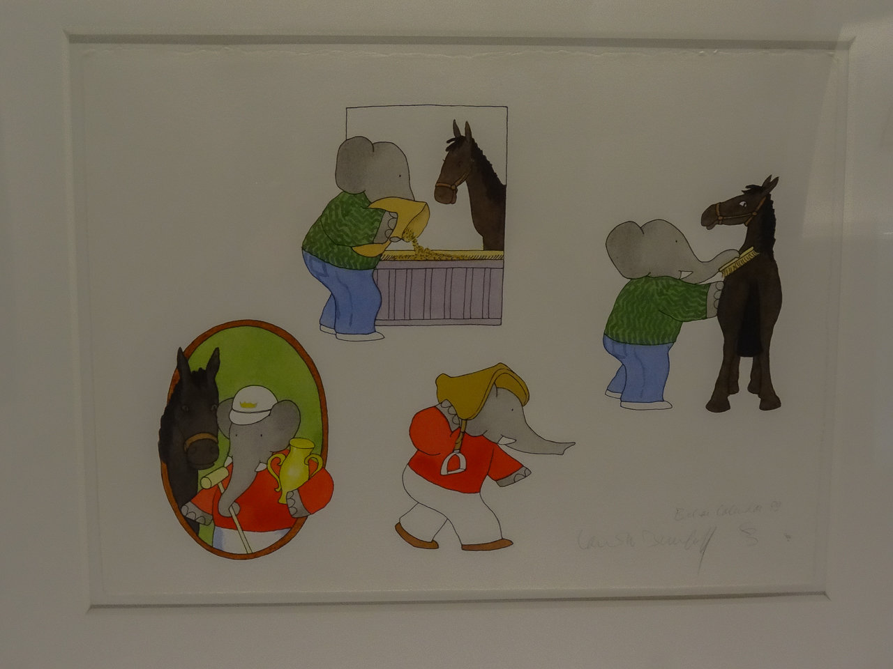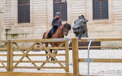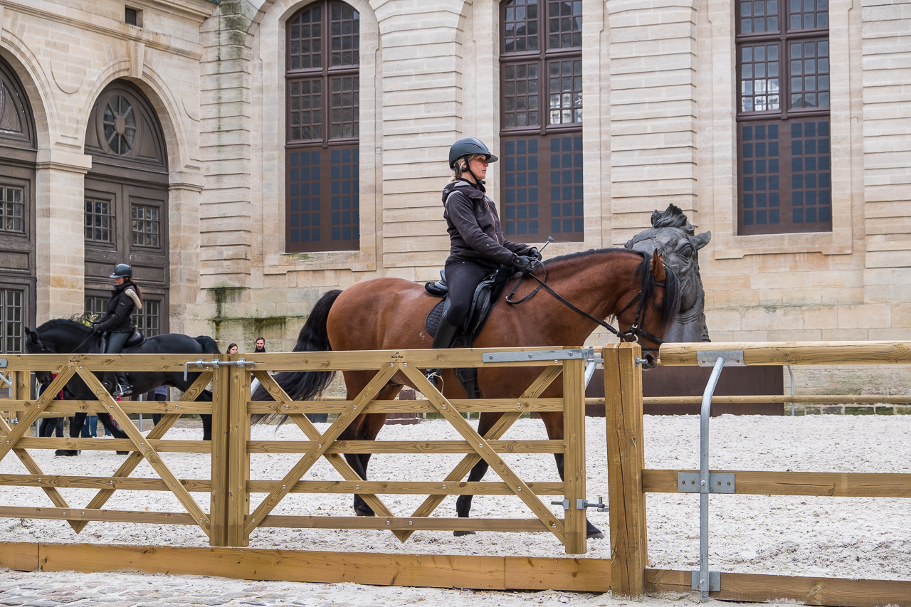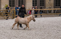 The stable houses Le Musée de Cheval, a very well designed and executed tribute to the horse. We were really spoiled by the last two museums in Portugal, and this one continued the winning streak. You enter through one of the main stable doors into an actual working facility full of horses. , right up the barn row .An interesting bunch – a Friesian, a Lusitano or two, some PREs, several Shetland Ponies, a couple of minis and even 3 burros. As it turned out, this bunch was the cast for the show they put on later in the afternoon. From there you travel through 15 well-appointed rooms, housed in the old stables, filled with displays and multi-media depicting the human interaction with equines from antiquity to the modern. A very nice collection well-presented and highly interactive. We were lucky as it turns out because after our walk from the Chantilly station we chose to stop first here rather than go on to the much more famous chateau. Since it was only 12:00, and the show was not until 2:30, most people make their visit in the other order. The result – we had it all to ourselves.