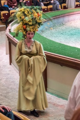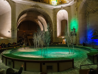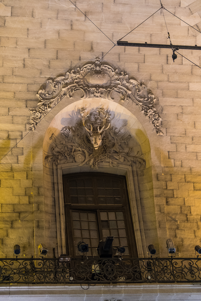 The show began promptly at 2:30, and we were shuffled into an auditorium built inside one of the original towers. A nice job of shoe-horning modern seating into an 18th century building. All the old decorations remained, tribute to the countless animals killed on the property during the grand hunts. A small riding ring at the center, and a little nook off to one side for the musicians. Before the show began, three young women rode in on horseback carrying signs – No Photos, No Video, No Phones. A simple but elegant solution to trying to cover every single language represented in the room.