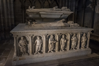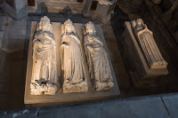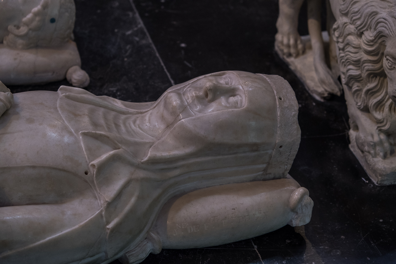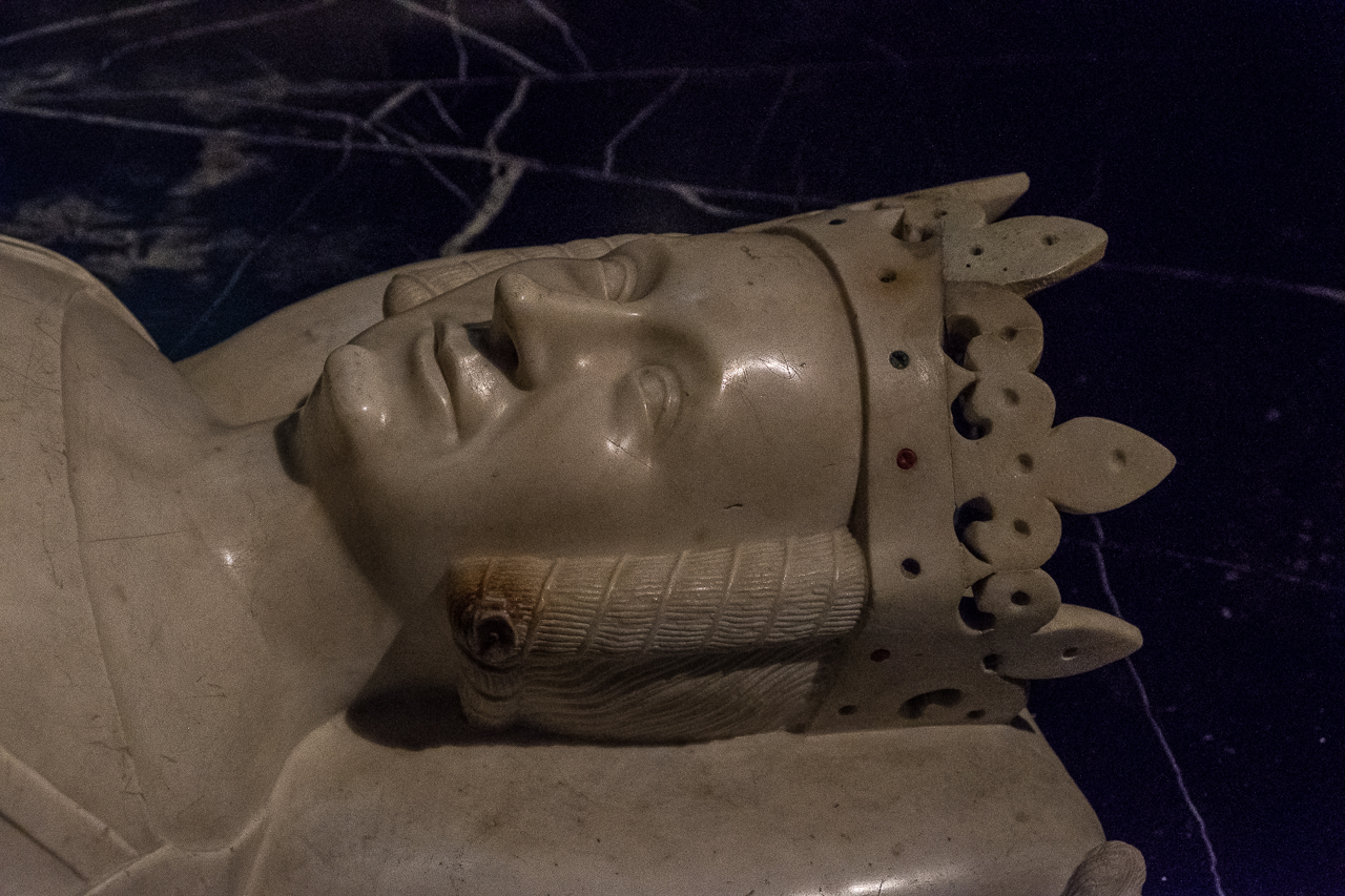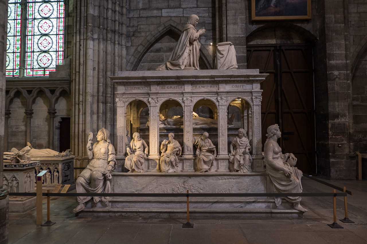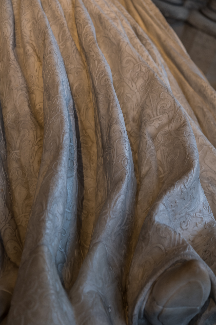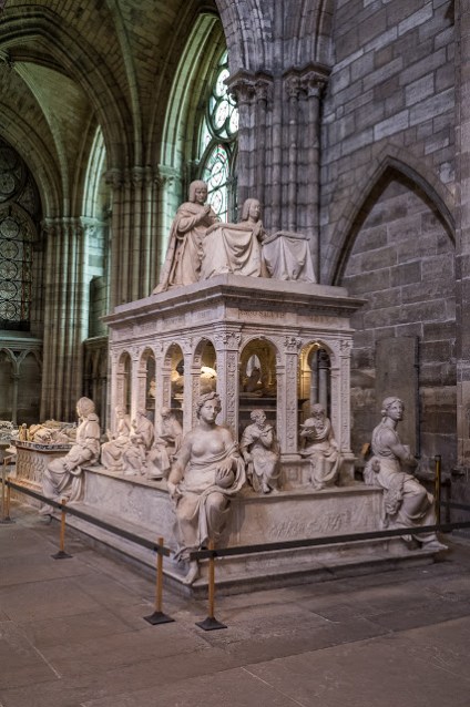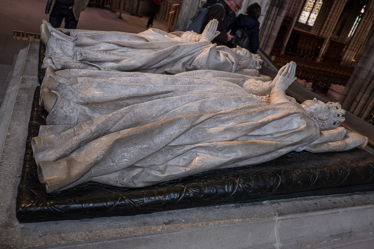 The tombs on the left side are both more modern (and fancier) and more ancient (less fancy.) Here is where you find the resting place of the 7th-12th century kings, alongside a monumental tomb from the 16th century for Henry II and Catherine de Medici. Louis XII and Anne de Bretagne (15th century) are for some reason shown dead, naked and flayed in the tomb but alive and praying on top.
