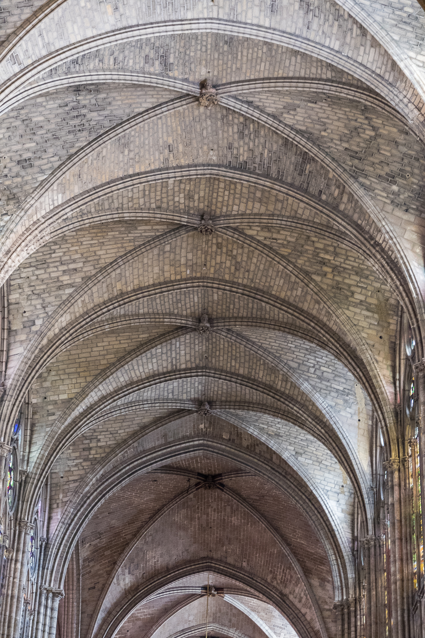 The core of the basilica was built here in 775, to house the relics of Saint-Denis and other martyrs. In the 8th century it became one of the most powerful Benedictine monasteries in medieval Europe. Beginning around 1100, the extremely intelligent and forward-thinking Abbot Suger began to transform it into a masterpiece of Gothic architecture that it is today. Fighting hard against the religious asceticism then in fashion, he sought to build an edifice that would awe the parishioners, royal and common alike. His greatest accomplishment was the “rose window,” the first truly stained-glass window to decorate a church. Prior to this, colored windows had been merely pieces of painted glass. Suger imported artisans who had the skill to introduce various oxides in glass while still molten to create the various colors, and then to build windows out that material. Dedicated in 1144 by King Henry VII and his queen, Eleanor of Aquitaine, Suger’s work forever changed the nature of cathedrals. The attending Bishops went back to their Sees and rebuilt the lot.