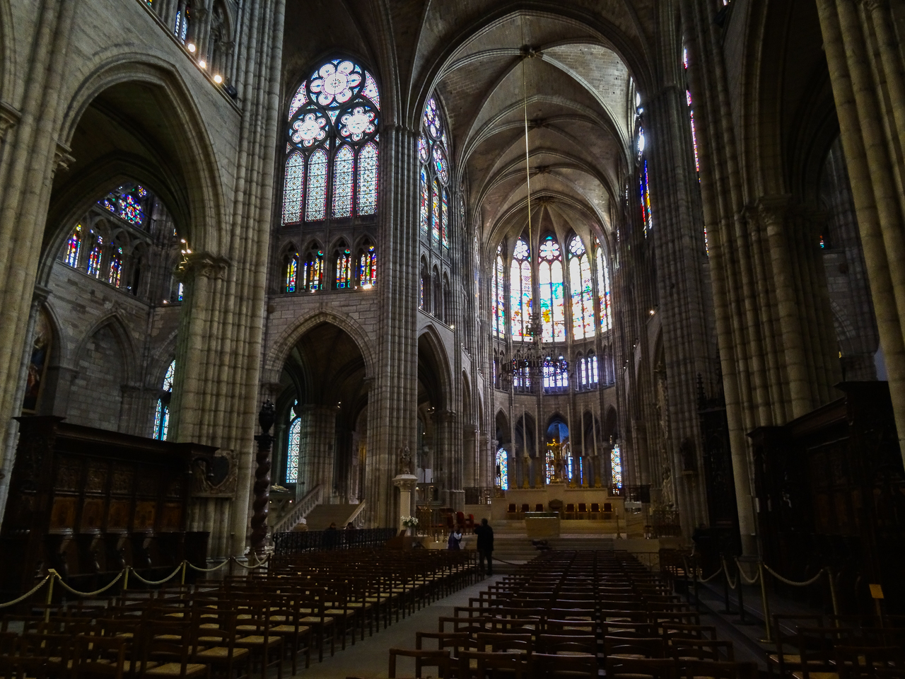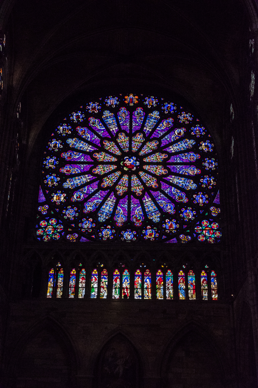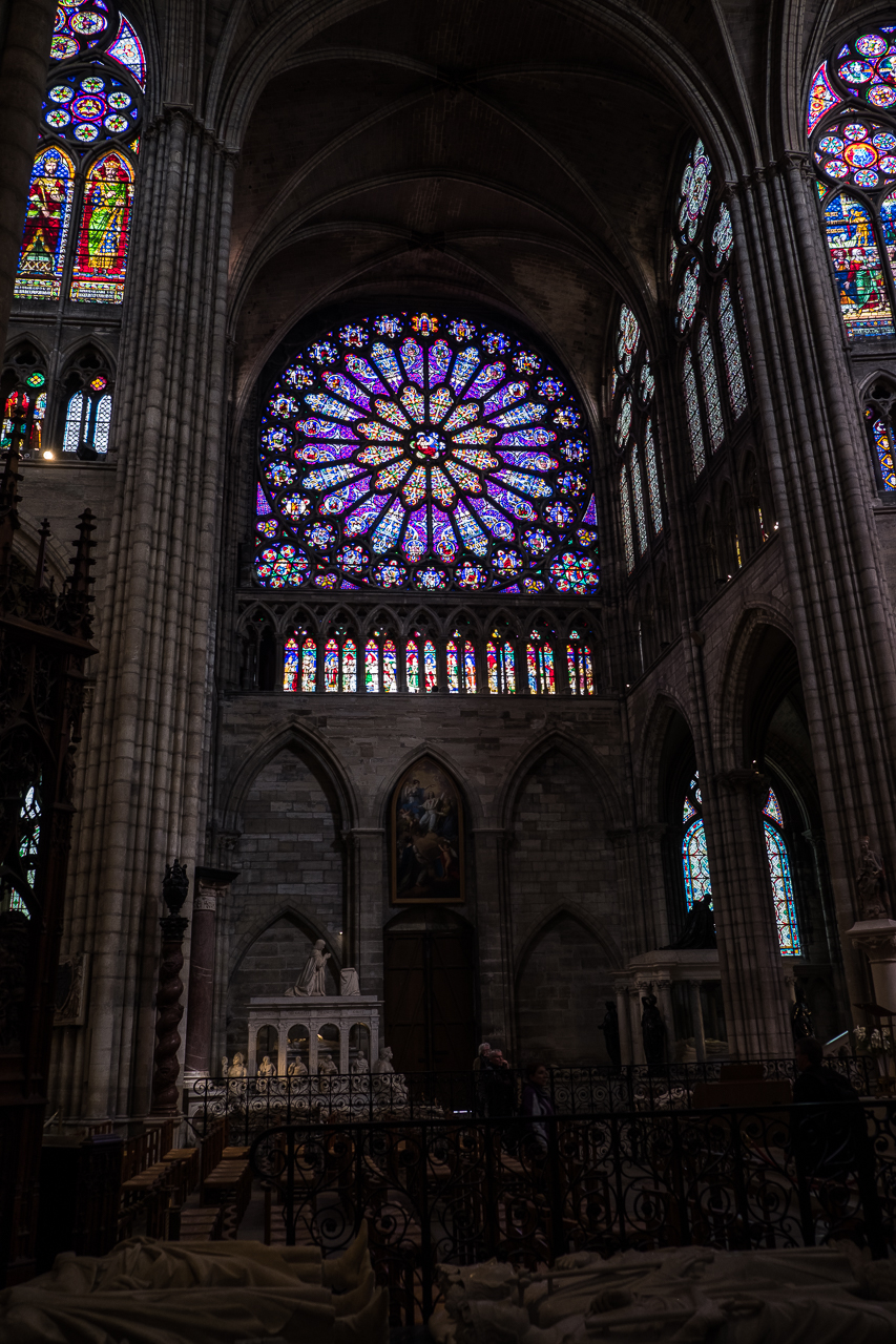 Quite an amazing church, magnificent but not gaudy, crowned all the way around by magnificent stained-glass windows. Rows of chairs fill the nave as the church is still used today by Parisians for regular services. On the right side of the nave are small chapels, filled with dozens of life-sized carvings of the kings and queens whose tombs they cover. There are so many that eventually they all blend into one giant short-term memory. Small placards describe who is entombed where.