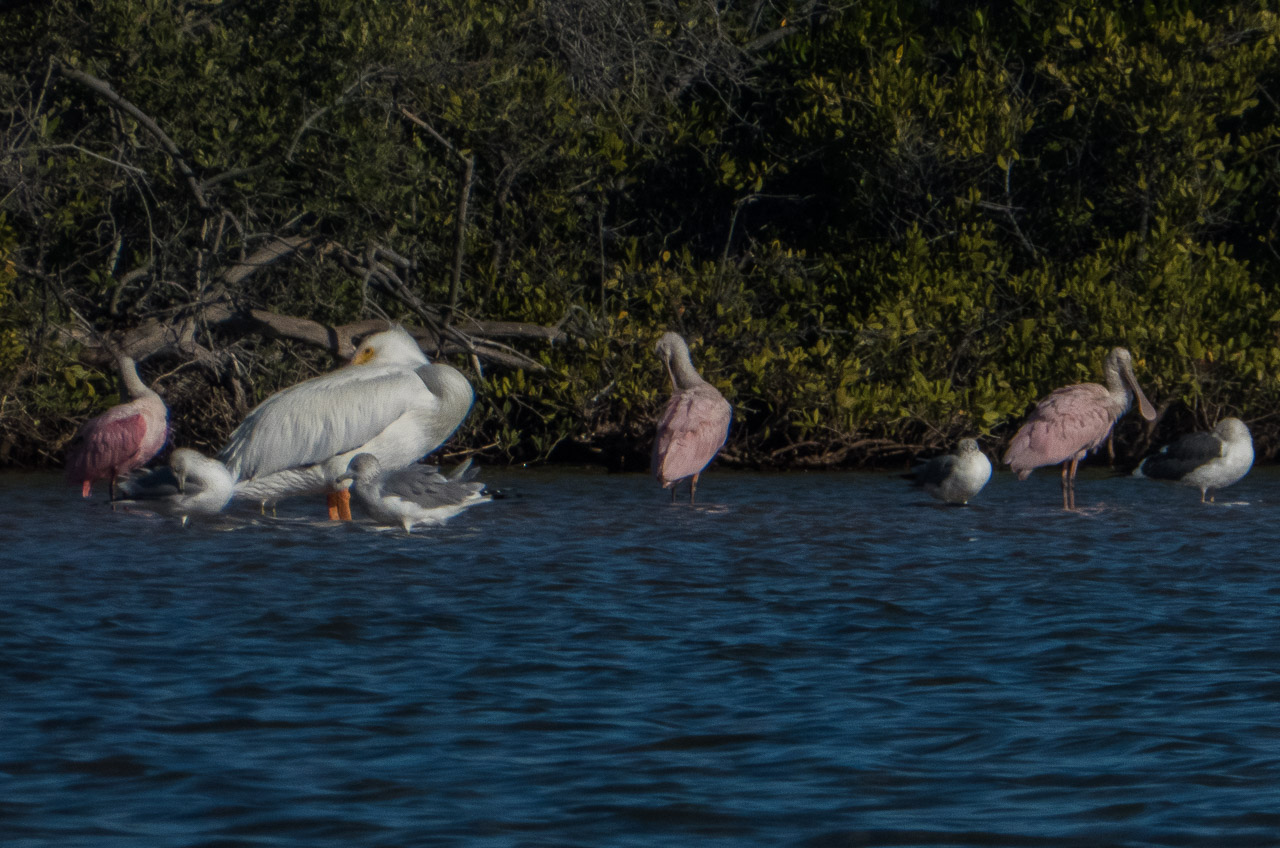 The birdlife is quite varied. Lots of Gulls and Terns fishing the waters, along with Brown Pelicans and a host of Egrets and Herons hanging out in the trees. Ten or more species are to be expected in only the first 15 minutes of paddling. Then you turn a corner and really start looking for the gems – American White Pelicans and if you’re lucky, Roseate Spoonbills. Far out of sight from any road or trail, they’re accessible only by water. And today was not disappointing for standing on the only bit of mudflat above the high tide were 21 pelicans. I stopped and let the wind slowly loft my boat past them. If you don’t get too close, they’re very tolerant and today they just solemnly stood while I floated past. I took a broad arc out into deeper water and left them behind before circling back in their direction. Taking a closer look from this vantage, I realized the pelicans had been obscuring 3 Spoonbills, hiding out behind them. Another kayaker, a British woman judging from her accent, said “aren’t they beautiful” and then proceeded to quiz me on the other birds there on the sandbar. Willets, Laughing Gulls, and Forster’s Terns filled out the remaining space. We chatted for a moment before she went off into deeper water and I turned back towards home.