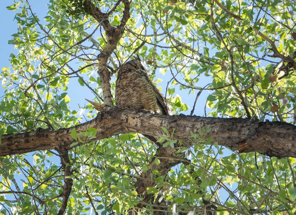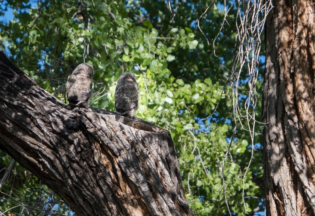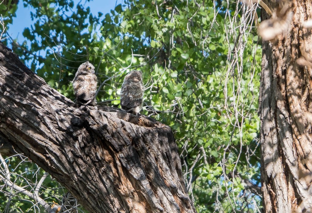 There’s an old Cottonwood along the irrigation ditch where we walk that has a reputation for being a bit of an “Owl Factory.” A large branch, about halfway up sports a cavity formed when some other branch fell off years ago. A pair of Great-horned Owls use that spot for a nest.