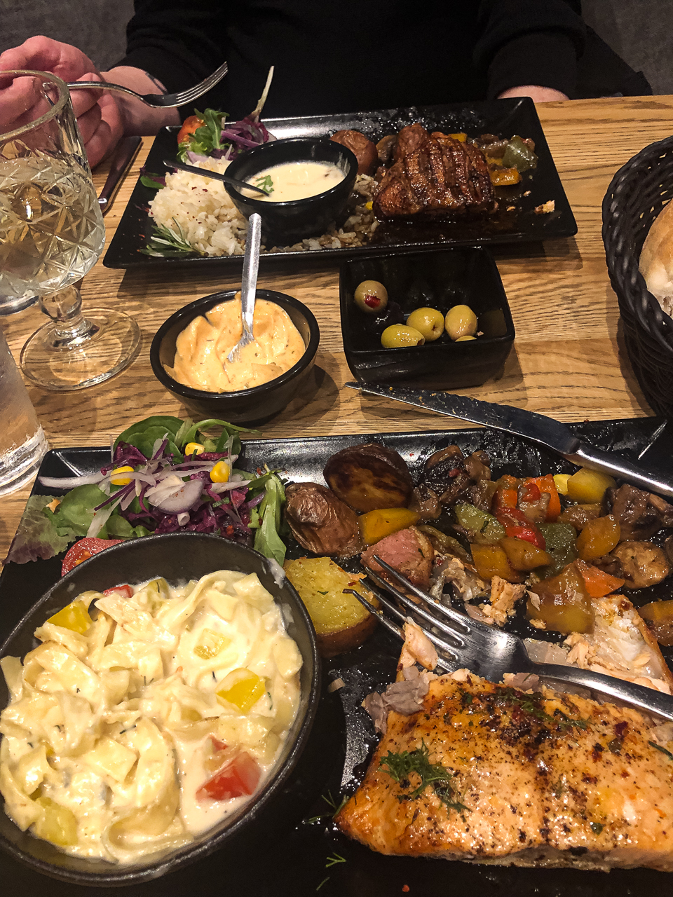 While we were resting, I spent some time on Google Maps looking from the sky view of restaurants across the city. In particular, those that wouldn’t require a long haul. I was focusing on two key parameters in addition to distance – available online booking and a menu. A few made the cut based on distance, and a few less on the booking. Most had a menu I could read, but none of those looked interesting. Finally, I found one very close by (across the street and down half a block,) and a table available at 8 PM. The menu though was a problem, it was only in Dutch and while I’ve picked up some, I haven’t yet completed the “menu nuances” unit. But it described itself as “Mediterranean Food” so what could possibly go wrong. At 7:45 I used “The Fork” app to book at 8 and out the door we went.