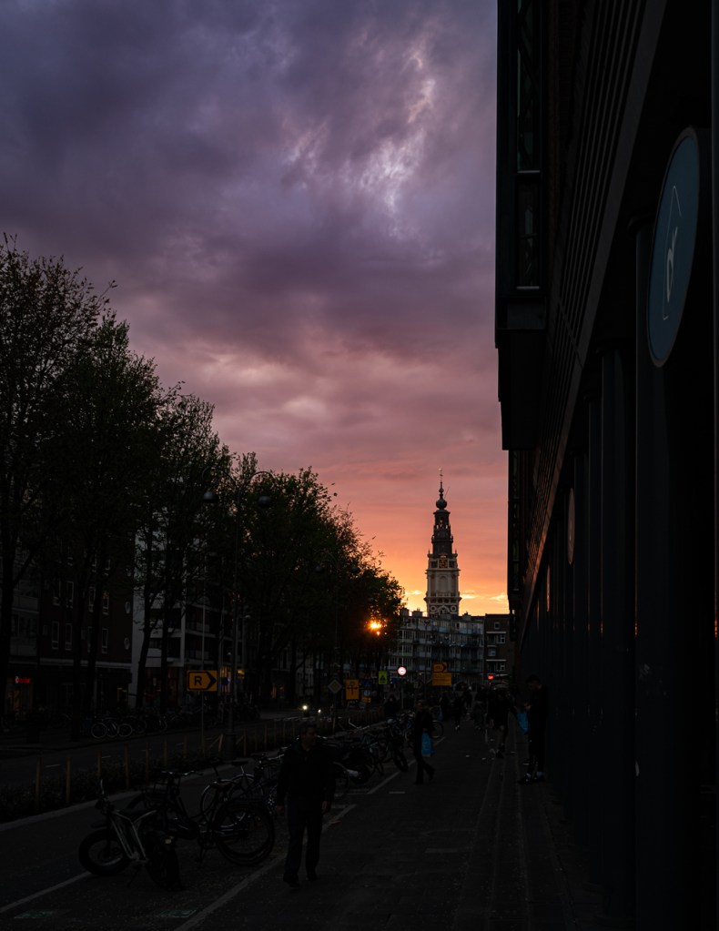 I had a nice chat with the waiter when I asked for the bill in Dutch, he asked why I was learning it, I explained my cramming process prior to this trip. We paid our compliments to the chef and left, only to find ourselves confronted by a backyard Corrales quality sunset, the golden clouds nicely framing the Zuiderkerk a mile or so away in the old town. Perfect end, perfect day.