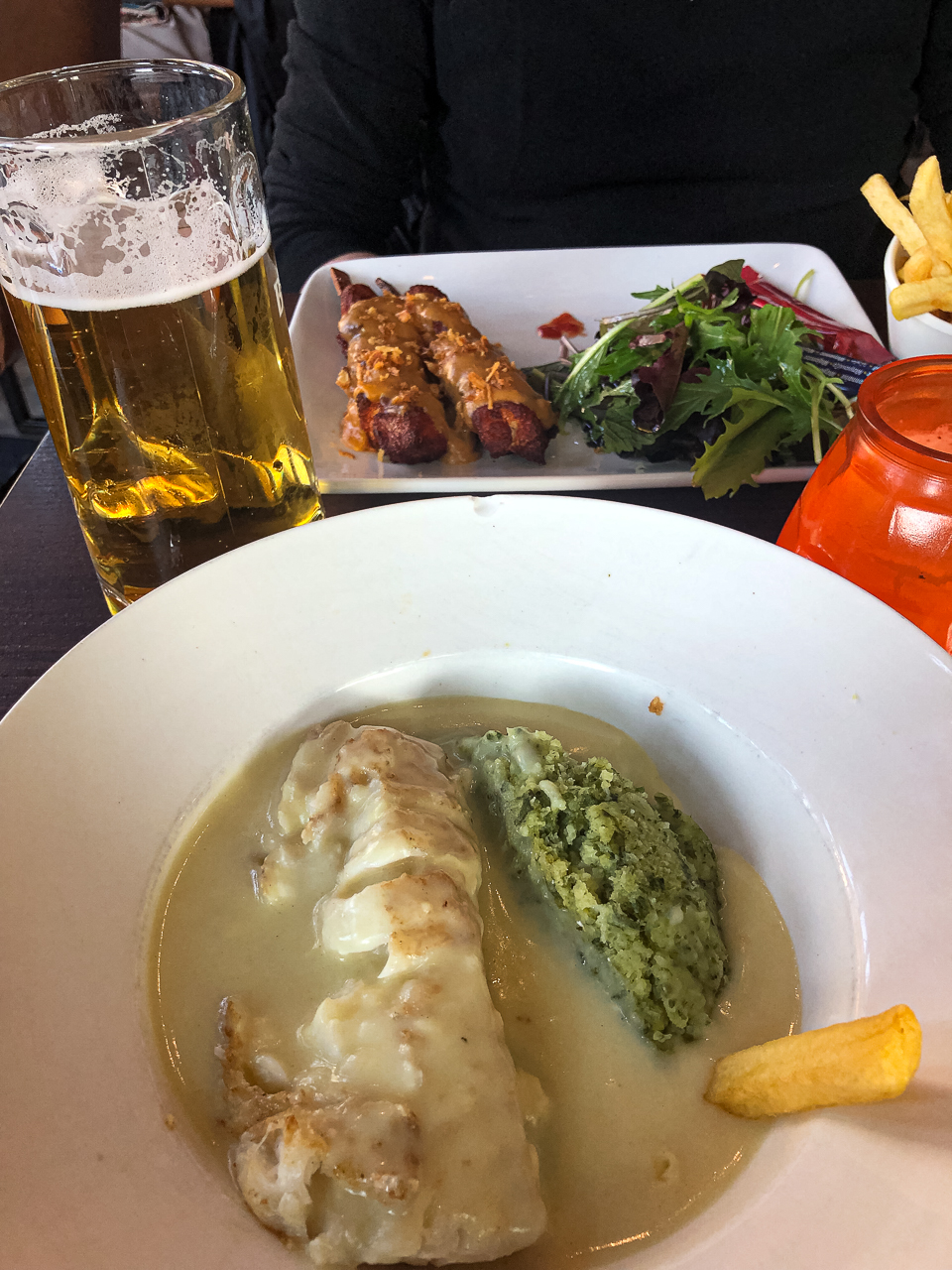 Our dinner there on Thursday had been pretty darn good so we had no worries about a repeat meal. Tonight, MLW had a version of the traditional Dutch Stampot. Normally a workingman’s fare thrown together out of whatever was available in the kitchen – stewed meat, potatoes, vegetables – this one was modernized and made with stewed spinach, pureed potatoes, and a nice piece of pan sauteed Cod. Healthy and tasty. I went with Kipsate, chicken skewers with peanut sauce. Traditional East Indies Dutch Colonial fare. Two more dishes off the list.