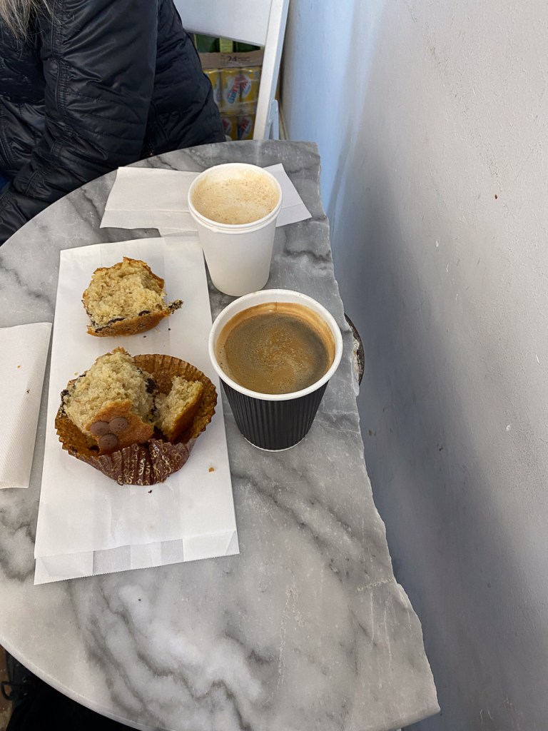 With nothing on the schedule, and the weather heading downhill we devoted today to wandering around the city center, covering streets and areas that we’d not yet visited. The day started at the little coffee shop we’d visited a couple of days ago. Chai, an Americano, a chocolate chip muffin, and a spot at a table that represented the neatest little bit of small retail ingenuity. If the second-hand table won’t fit, make it.
