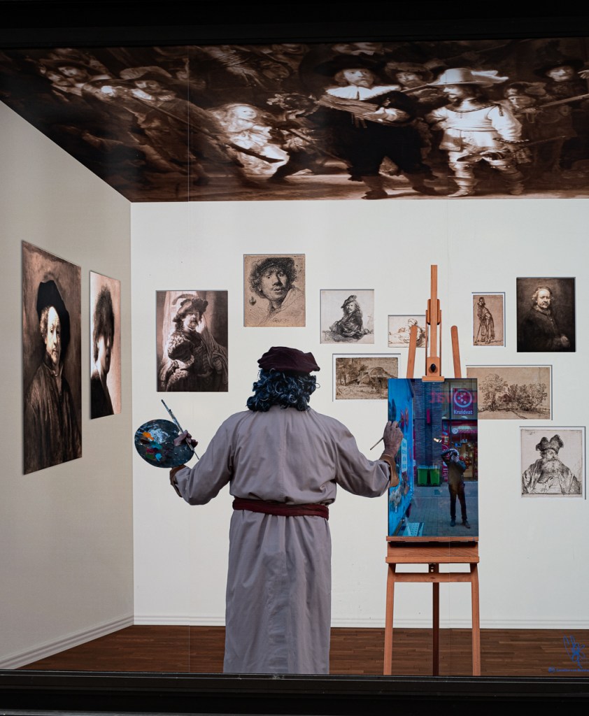 Along the way, we passed some cool things. The first was this clever art installation in a storefront. Rembrandt, working on a canvas to his left in his studio. The funny conceit – his canvas was a LED screen that displayed an image from a hidden camera facing the street. If you lined it up correctly, you can have a selfie painted by the master. Look carefully, that’s me on the canvas.