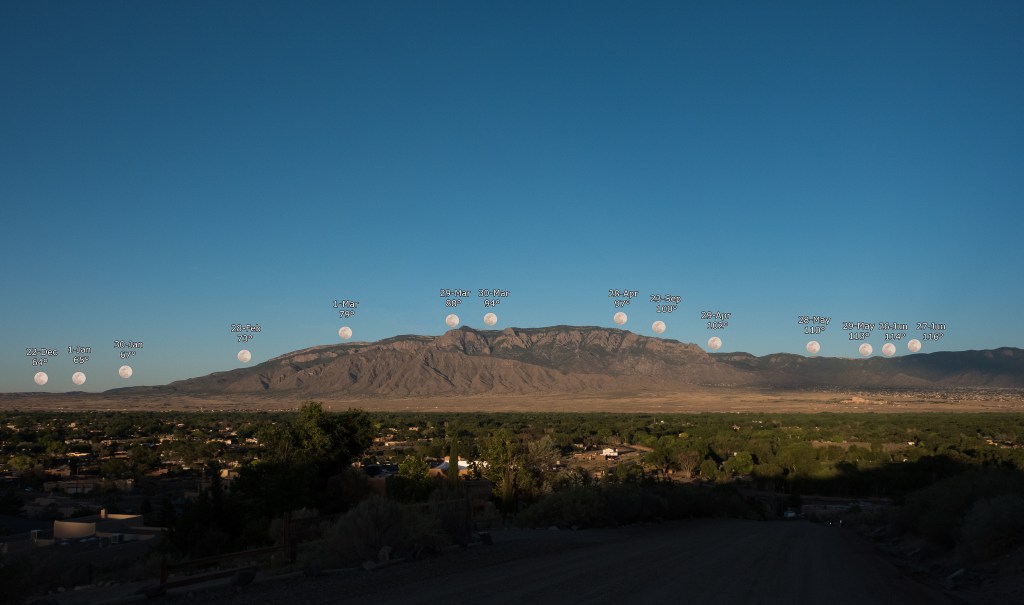 One year, I took a photo of the Moon in each of the twelve months. As it turned out, I was lucky that year – the weather was clear every time I went up. The result (with a lot of help from Photoshop) is a map of the point along the eastern horizon where it comes up, month by month, from the most northerly to the southern maximum.