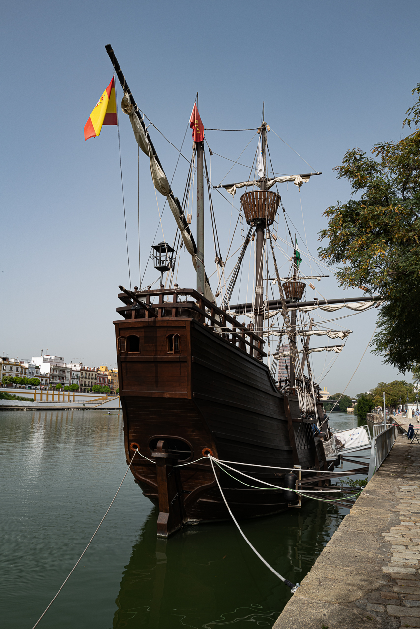 And speaking of adventure, parked alongside the Torre de Oro (the original treasure house from that time) was the Nao Victoria, the only ship among Magellan’s Armada de la Especiería (spice fleet) to complete the first circumnavigation of the globe. The fleet left Sevilla in August 1519 and the Victoria returned 3 years later in September 1522 manned by only 18 of the original 245 seaman who departed. The boat we saw was a replica, built in 1991 that has sailed all over the world. The original was lost with all hands in 1570 on a sail from Sevilla to the Antilles.
